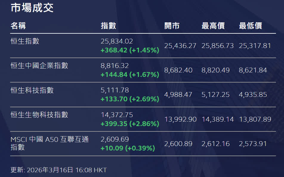 香港文匯報訊 雖然亞太區股市及商品市場繼續震盪,惟港股今日表現突出,三大指數全線高收。恒生指數收報25,834點,升368點或1.45%。國企指數升1.67%。恒生科技指數升2.69%,升幅跑贏恒指及國指。大市成交約2,644.53億元。