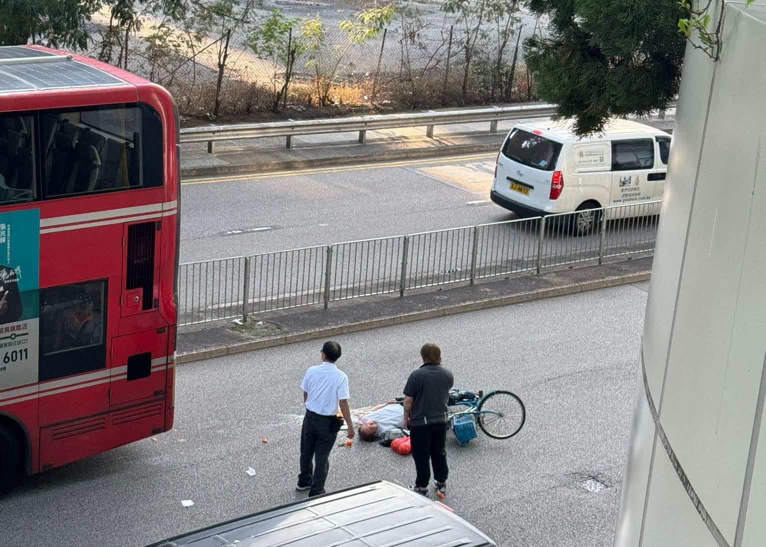 單車翁捱撞後人仰車翻,大字型攤臥地上,其個人物品則散落一地。