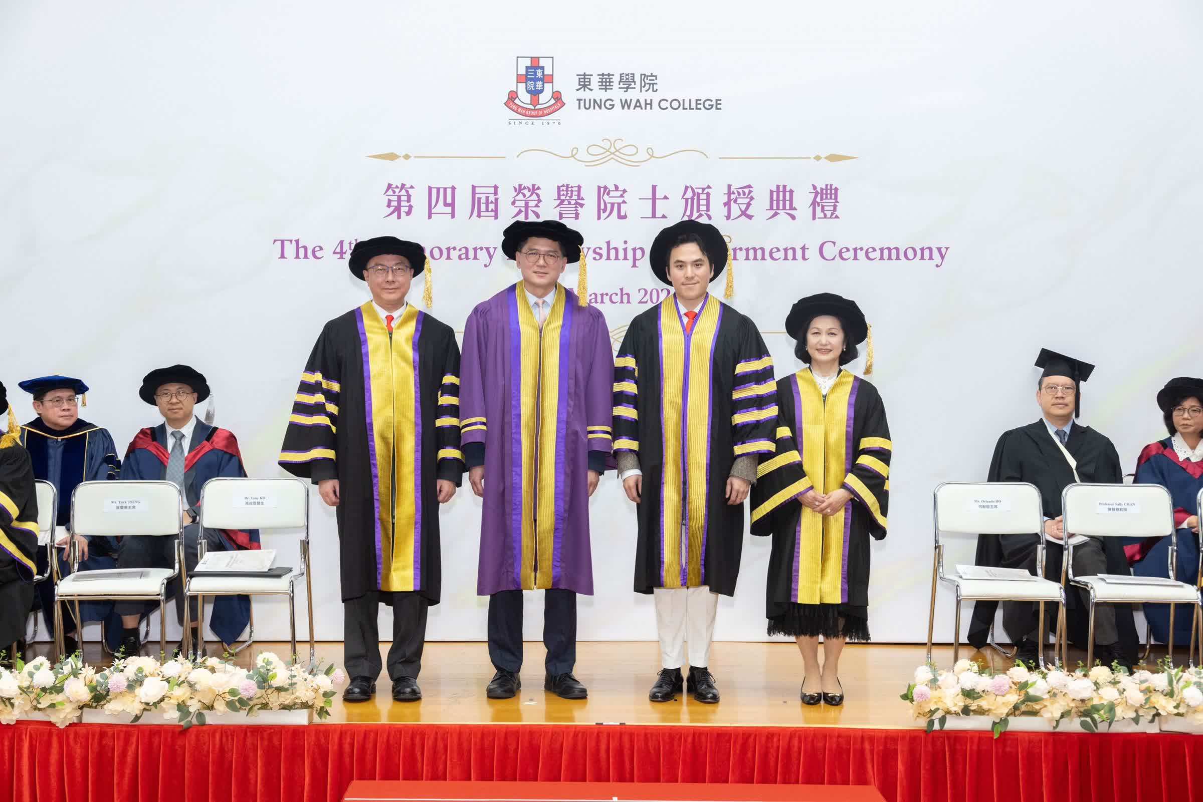 香港文匯報訊(記者 楊梓穎)東華學院於上周五(13日)舉行第四屆榮譽院士頒授典禮,由東華三院乙巳年董事局主席暨東華學院校董會主席何猷啟主持頒授儀式,向醫管局前行政總裁高拔陞及教授劉敏如頒授榮譽院士銜,以表揚兩人於各自專業領域的卓越成就,以及對社會作出的重大貢獻。