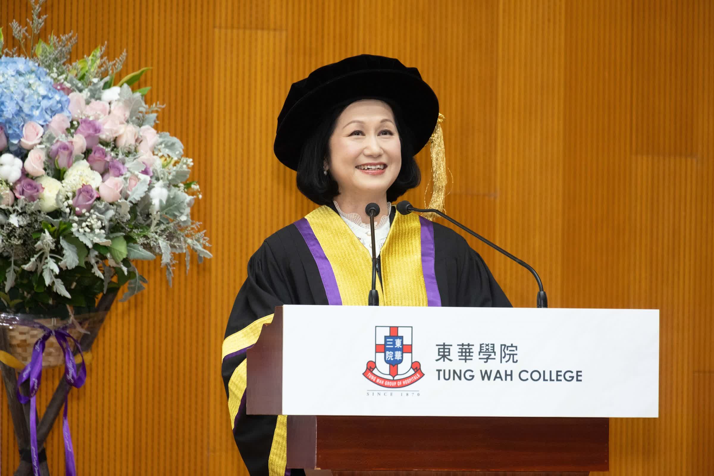 東華學院校長陳慧慈在典禮上歡迎兩位傑出翹楚加入學院大家庭,感謝二人成為學院的摯友良伴,並為同學及社會樹立典範。她表示:「我們尤其高興在學院發展的關鍵階段,迎來兩位榮譽院士的加入。今年,學院正步入成為私立大學及應用科學大學的最後階段,學院上下眾志成城、蓄勢待發,共譜新章。我深信,只要我們繼續堅守學術卓越、勇於創新,必定能在升格之路上獲得社會各界的廣泛認可。」