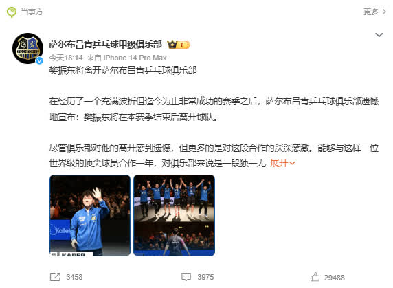 樊振東本人表示:「我想向薩爾布呂肯乒乓球俱樂部表達我最誠摯的感謝,感謝他們給予我這次難以置信的機會。這是我職業生涯中一段非常特別的經歷。不過在職業生涯的這個階段,我也已經準備好邁出新的步伐。杜塞爾多夫俱樂部是歐洲乃至世界乒乓球最強大的力量之一,而我與波爾(Timo Boll)之間深厚的友誼也激勵我去迎接新的挑戰。明年以對手的身份與薩爾布呂肯交手一定會是一種很特別的感覺,我已經開始期待這些對決。不過我在這裏的旅程還遠沒有結束。在賽季的最後一場比賽之前,我都會全力以赴,希望能夠和球隊一起在這個賽季創造歷史。」