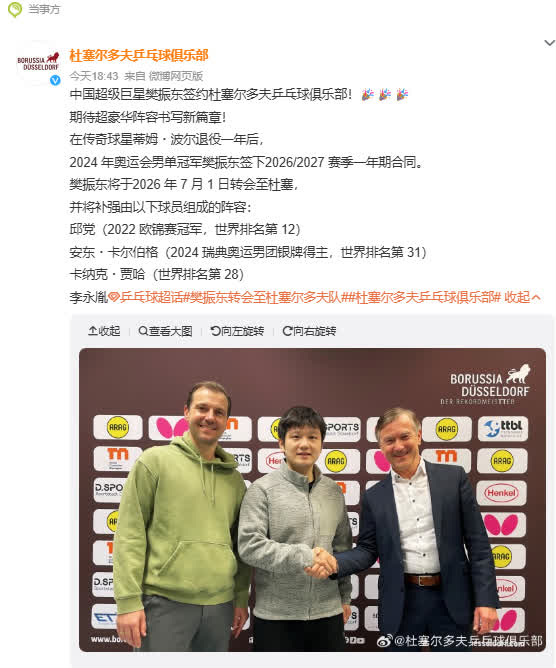 TTBL發布最新轉會消息,樊振東將在下賽季繼續征戰德甲乒乓球甲級聯賽,轉會加盟杜塞爾多夫俱樂部。杜塞爾多夫俱樂部官網發布聲明確認,球隊簽下奧運冠軍樊振東。