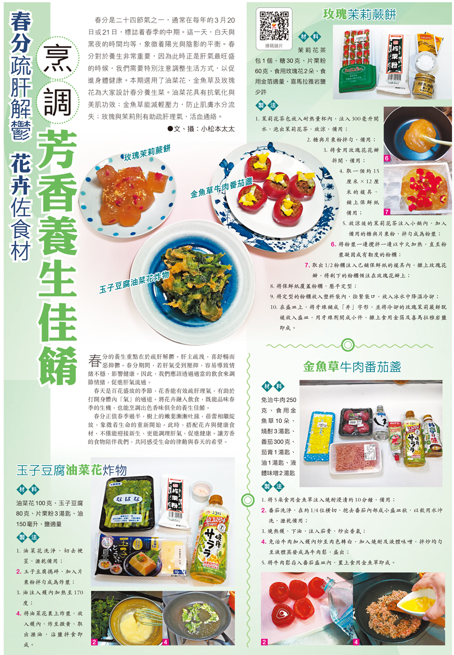 春分是二十四節氣之一,通常在每年的3月20日或21日,標誌着春季的中期。這一天,白天與黑夜的時間均等,象徵着陽光與陰影的平衡。春分對於養生非常重要,因為此時正是肝氣最旺盛的時候,我們需要特別注意調整生活方式,以促進身體健康。本期選用了油菜花、金魚草及玫瑰花為大家設計春分養生菜。油菜花具有抗氧化與美肌功效;金魚草能減輕壓力,防止肌膚水分流失;玫瑰與茉莉則有助疏肝理氣,活血通絡。
