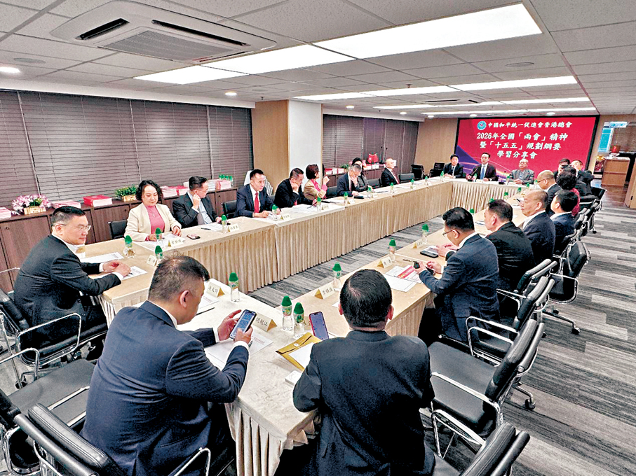 香港文匯報訊(記者 黃子龍)中國和平統一促進會香港總會昨日舉辦2026年全國兩會精神暨「十五五」規劃綱要學習分享會。由全國政協常委、總會會長姚志勝主持,20多人先後發言。港區全國人大代表、政協委員、總會會務骨幹超過30人參加。與會者一致認為,要積極動員社會各界,按照中央的要求,支持行政長官李家超領導特區政府制定好首份香港五年規劃,全面對接國家戰略,為強國建設和香港由治及興作出新的貢獻。