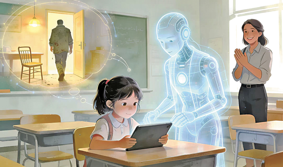 課堂還有一個特殊的「參與者」。金丹陽請人工智能以四年級學生的身份加入討論:「生活中,你會為什麼心跳加速?」AI生成了一段關於上台領獎的生動描寫。「誰來評價一下這位『同學』的作文?」孩子們興致勃勃,認為它「寫得清楚,合乎情理」。