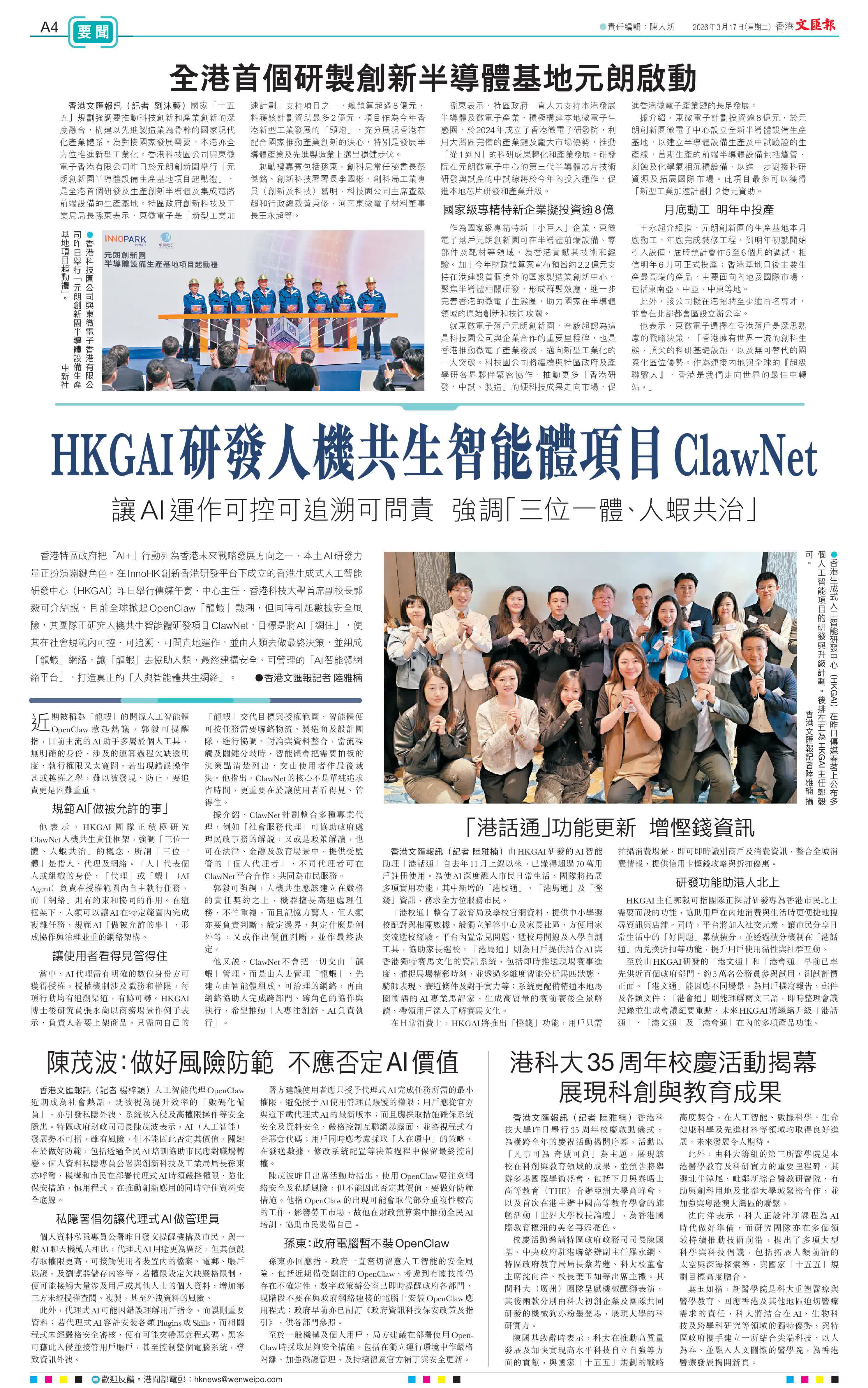 (香港文匯報記者 陸雅楠)香港特區政府把「AI+」行動列為香港未來戰略發展方向之一,本土AI研發力量正扮演關鍵角色。在InnoHK創新香港研發平台下成立的香港生成式人工智能研發中心(HKGAI)昨日舉行傳媒午宴,中心主任、香港科技大學首席副校長郭毅可介紹說,目前全球掀起OpenClaw「龍蝦」熱潮,但同時引起數據安全風險,其團隊正研究人機共生智能體研發項目ClawNet,目標是將AI「網住」,使其在社會規範內可控、可追溯、可問責地運作,並由人類去做最終決策,並組成「龍蝦」網絡,讓「龍蝦」去協助人類,最終建構安全、可管理的「AI智能體網絡平台」,打造真正的「人與智能體共生網絡」。
