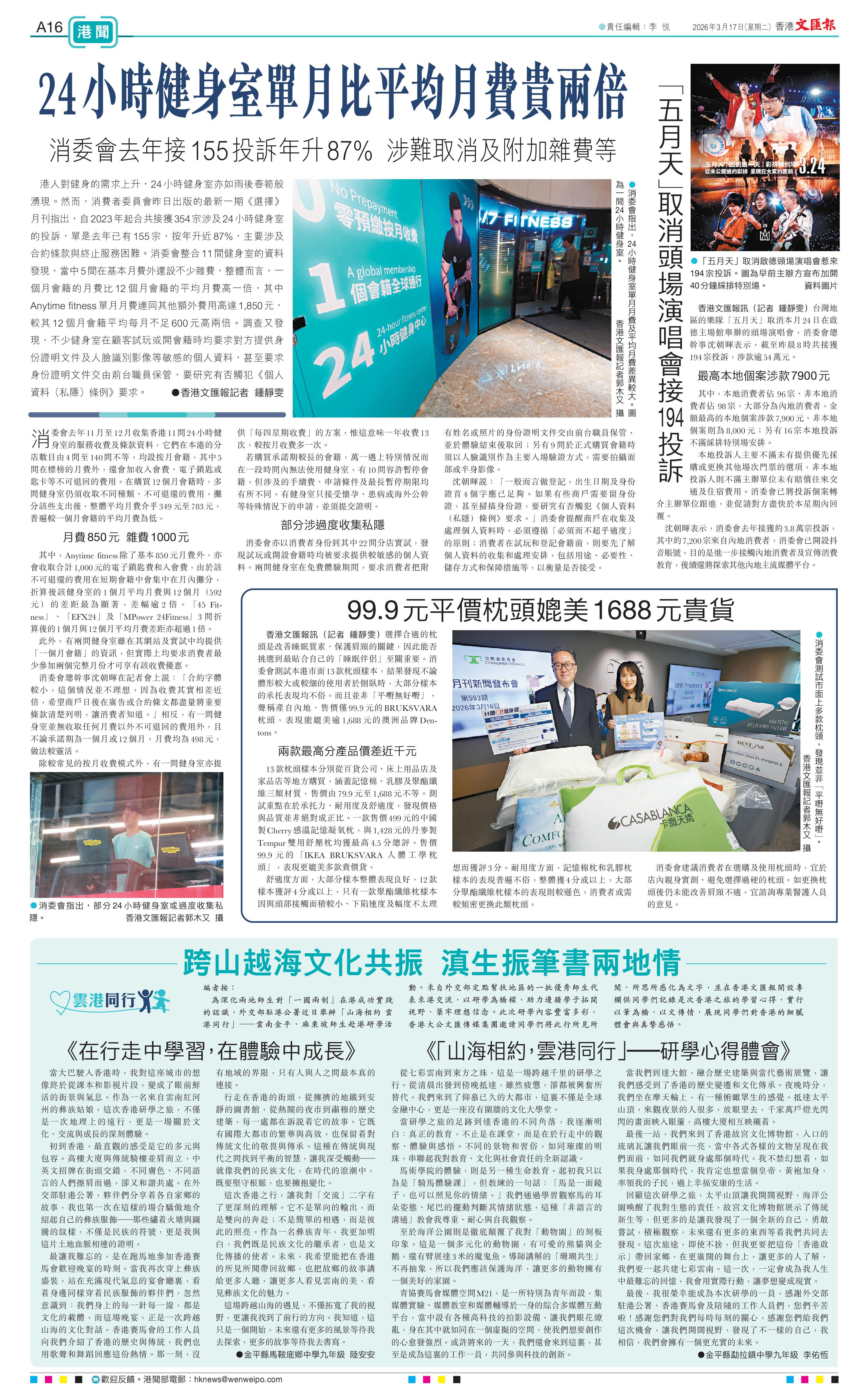 其中,本地消費者佔96宗、非本地消費者佔98宗,大部分為內地消費者,金額最高的本地個案涉款7,900元、非本地個案則為8,000元;另有16宗本地投訴不滿綵排特別場安排。