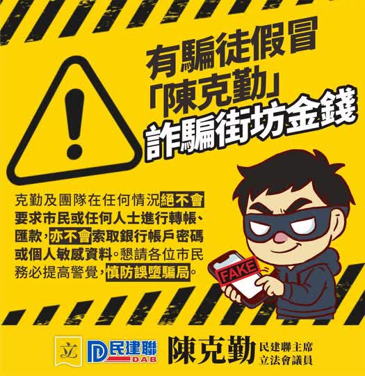 立法會議員陳克勤表示,今早有不法分子假冒他的身份,透過電話聯絡街坊,以虛假理由誘騙事主轉賬。目前,他及團隊已即時協助事主向警方報案,及聯絡相關銀行機構,爭取凍結款項及追回損失。