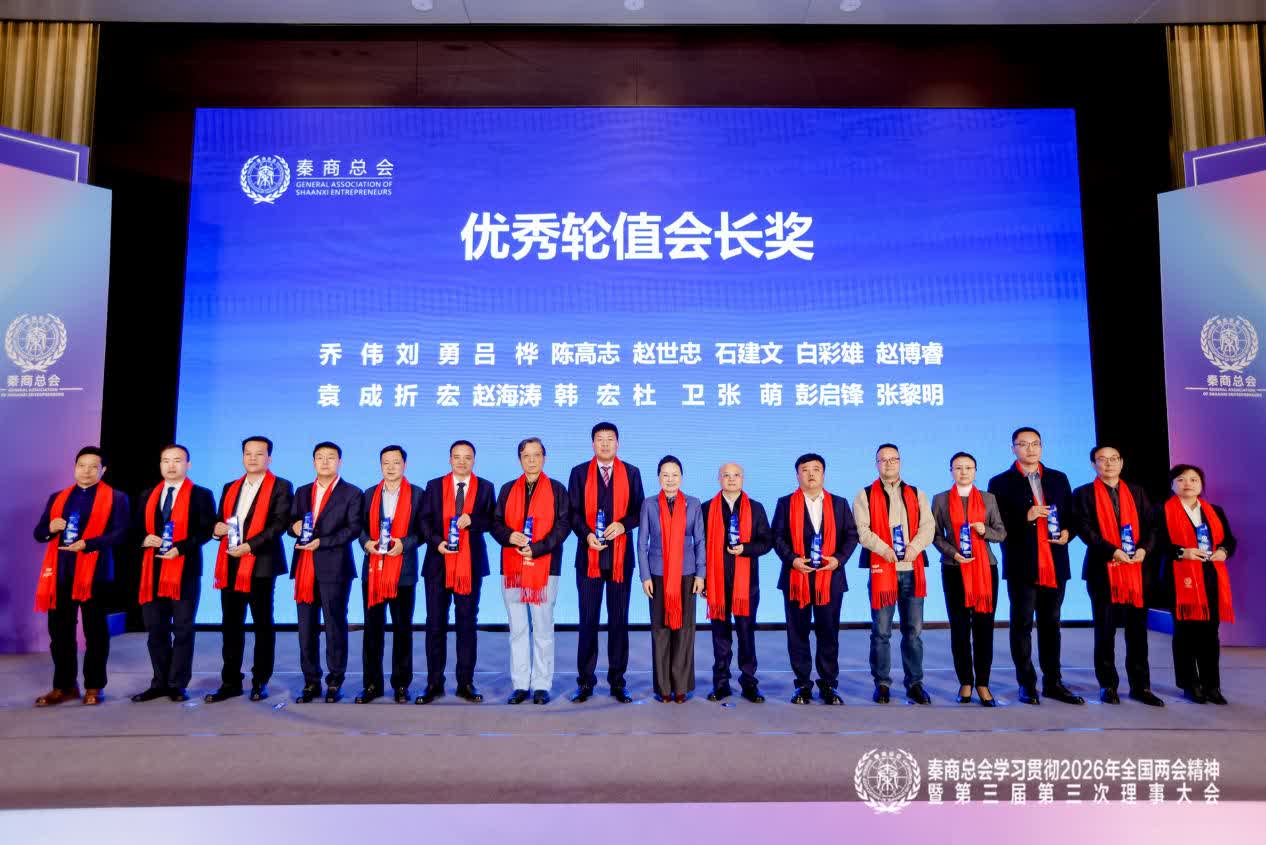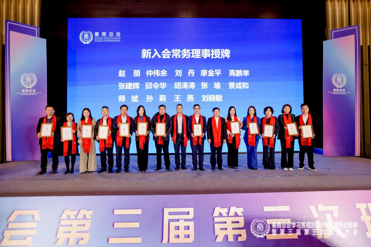 秦商總會當日還同時召開了第三屆第三次理事大會,秦商總會黨委書記劉阿津主持會議。會議審議並通過了《秦商總會2025年度工作報告及2026年度工作計劃》、《2025年度財務報告及2026年度財務預算》,以及《秦商總會「三重一大」事項決策事項清單》。大會還審議通過了2025年度增補會員報告,並舉行了隆重的新會員授牌儀式,歡迎新力量加入秦商大家庭。此外,為表彰先進,大會對2025年度「金伯樂獎」、「優秀輪值會長」以及「『秦』勞模範獎」獲得者進行了表彰,感謝優秀會員對秦商總會發展做出的積極貢獻。