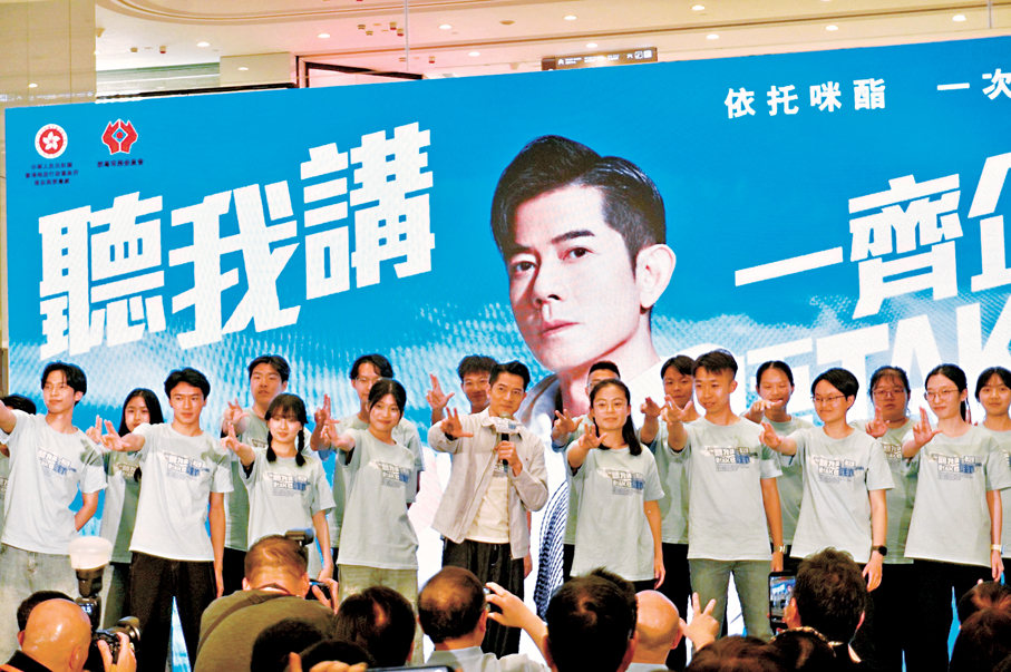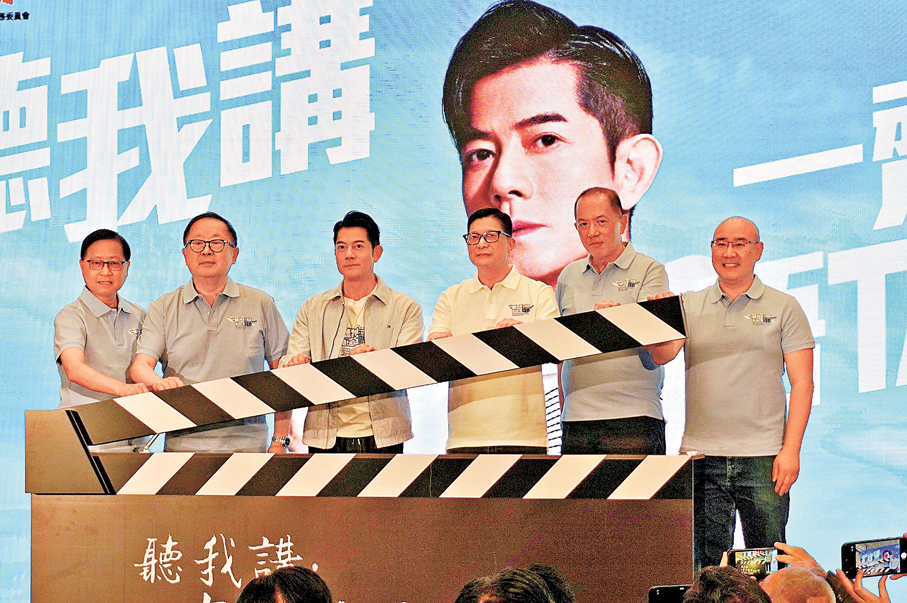 香港文匯報訊(記者 子棠)郭富城(城城)以榮譽禁毒專員身份,聯袂保安局局長鄧炳強昨日出席「聽我講:一齊企硬唔take嘢」宣傳活動,並與一眾主禮嘉賓以巨型導演板進行「打板」啟動禁毒片首播儀式,及帶領全場一起做動作高呼宣傳口號。城城即席與青年禁毒大使及在場人士一齊學習舞步,推廣禁毒潮語,呼籲年輕朋友拒絕誘惑,企硬共築無毒城。