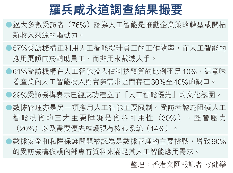 Matthew Phillips又指,受訪金融機構對人工智能賦能業務的前景抱有極高期望。由於人工智能的價值遠不止於提升營運效率,更是重塑以人工智能原生為導向的經營模式、重建服務體驗與創新商業模式的關鍵機遇,不容錯失,因此相關金融機構需要作出更多改革,包括增加與人工智能相關的科技預算,藉以更好地利用人工智能增加收益、提升市場地位、發掘新增長機會與拓展策略發展空間。