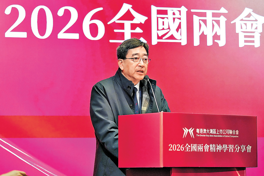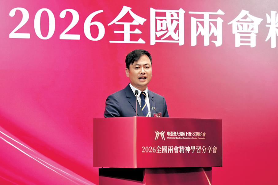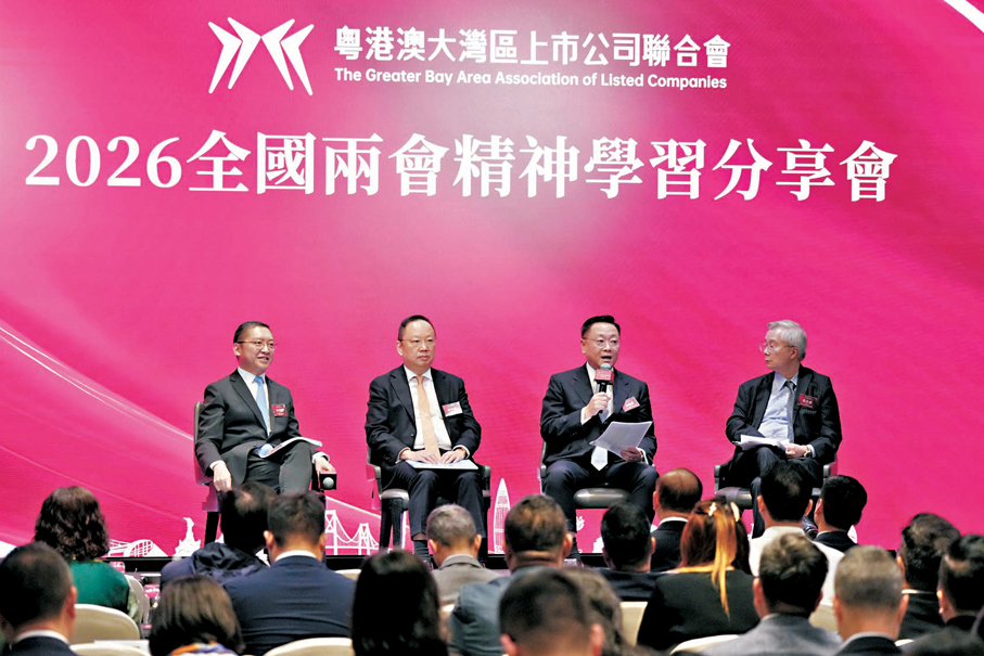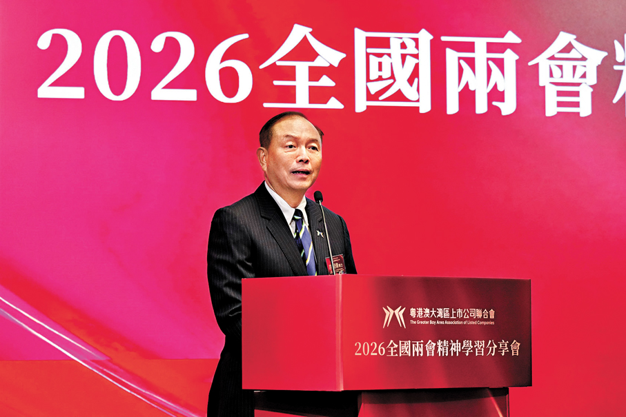 為深入貫徹落實全國兩會精神,把握時代發展的風向標,激發粵港澳大灣區高質量發展的活力,由粵港澳大灣區上市公司聯合會主辦的2026全國兩會精神學習分享會昨日在港舉辦。活動請了多位港區全國人大代表、全國政協委員出席,並吸引粵港澳大灣區上市公司、科技企業等逾150位嘉賓出席,現場學習氛圍熱烈。粵港澳大灣區上市公司聯合會創會主席鍾學勇致辭時強調,大灣區未來的競爭力不再是單一技術的競爭,而是「企業家+金融家+科學家」黃金組合的生態競爭。香港既是連接全球創新資源的「磁石」,也是內地企業走向世界的「樞紐」。