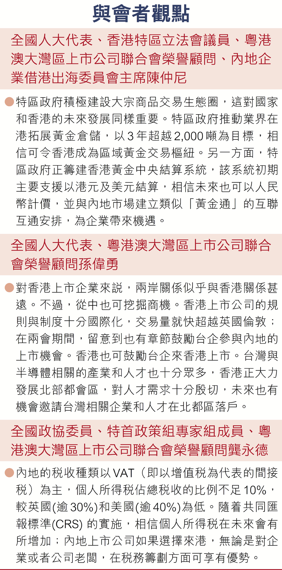 出席同一場合的粵港澳大灣區上市公司聯合會創會會長許國偉指出,今年兩會高頻詞是「高質量發展」與「新質生產力」,標誌着國家對科技創新與產業升級的要求愈發迫切。香港在發揮國際化及專業服務優勢的同時,將在國家高水平對外開放中實現更大價值。他鼓勵與會企業打好「協同」與「人才」兩張牌,善用大灣區的優勢,在新時代跑出「加速度」。
