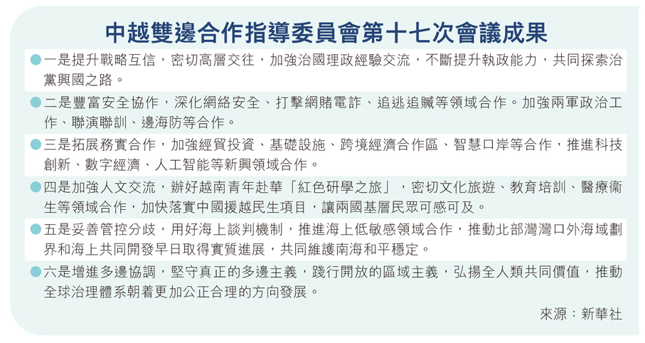 二要強化戰略定力,弘揚共同理念。雙方同意統籌推進高質量發展和高水平安全,支持對方深化改革和開放,更好造福兩國人民。中越自主探索符合本國國情的發展道路、加快實現現代化,將為廣大發展中國家提供有益借鑒,符合人類發展進步方向。