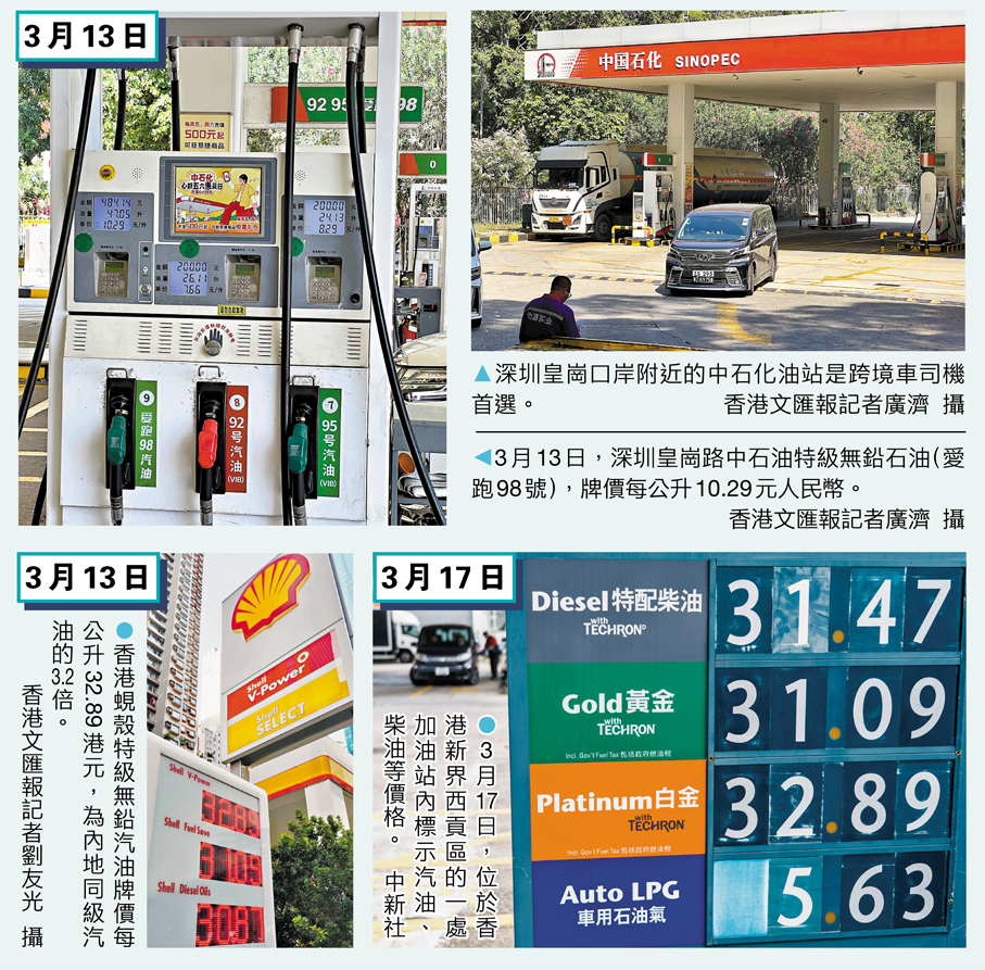 「落馬洲中港貨運聯會」主席蔣志偉接受香港文匯報訪問時指出,近期受戰爭影響,國際油價急升,兩地油價差距進一步擴大。「以前,司機因為應急都會被迫在香港入油,現在絕對會去深圳或珠海入油,只要有時間,一進入內地就把油缸加滿,長期保持滿油狀態。」