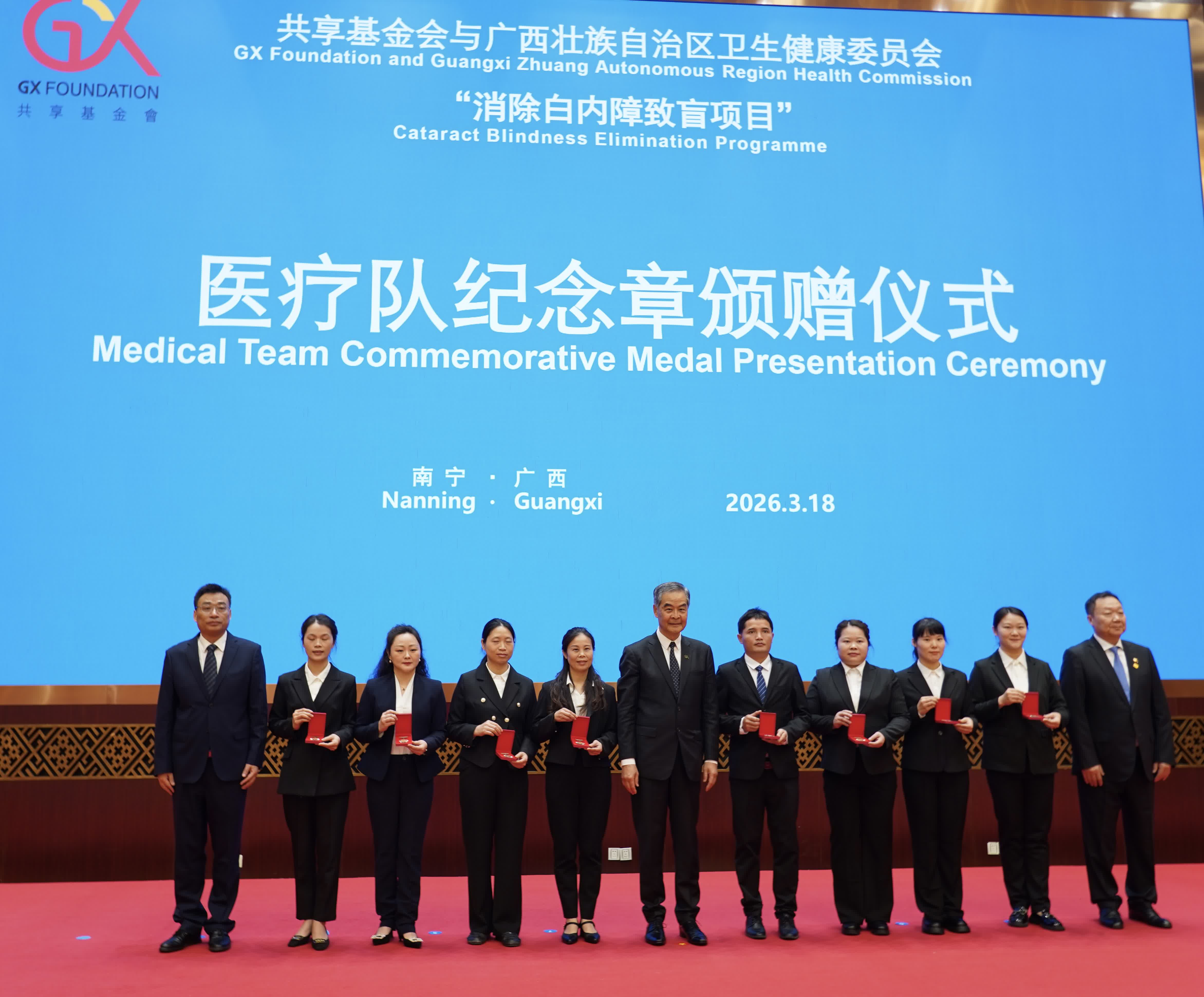 全國政協副主席、基金會主席梁振英在3月18日向近五期赴柬埔寨執行任務的34名廣西醫療隊成員頒贈紀念章。該五期醫療隊在當地共完成1,543例白內障復明手術,為當地患者帶來重見光明的希望。