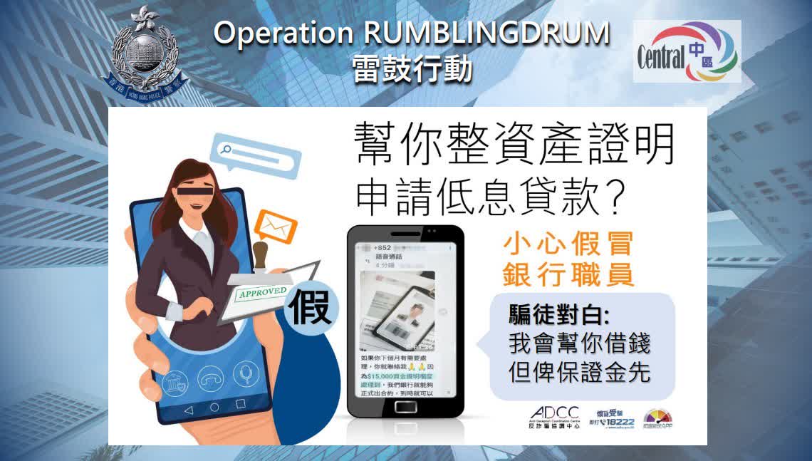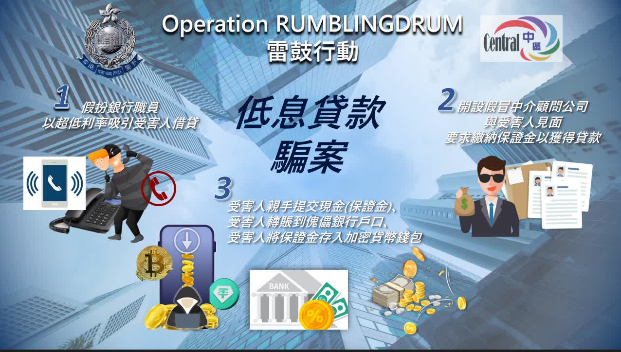 中區警區刑事部早前部署代號「雷鼓」行動,昨日(17日)起一連兩天,在全港各區以嫌「串謀詐騙」拘捕3男3女,年齡介乎29至63歲,包括有黑幫背景的骨幹成員,負責招募人頭戶開設空殼公司、虛假的中介顧問公司和開設傀儡戶口。重案組探員持法庭搜查令,在詐騙集團的貸款中介顧問公司,搜出涉案文件和電腦,現正追查騙款下落。 13名受害人中,部分有大專或碩士學歷,包括無業人士、有商人及公司東主。警方相信騙徒主要利用受害人急需周轉資金及貪圖低息的心理行騙。