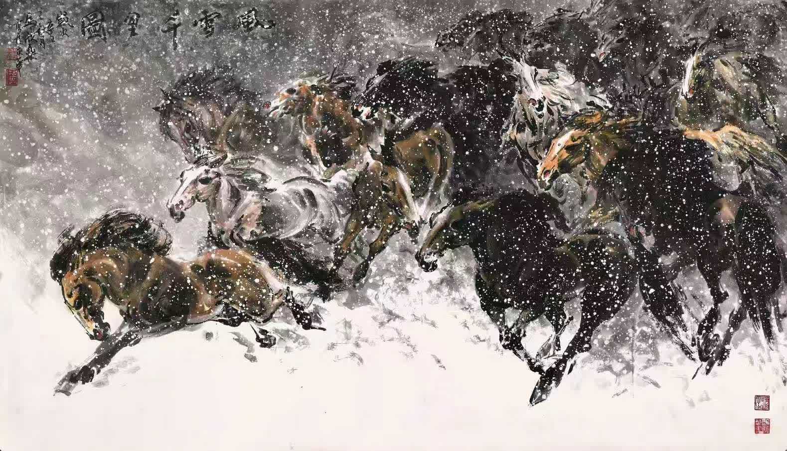 從題材而言,馬欣樂的涉獵面極為廣泛,無論人物、風景、花鳥皆能兼顧,尤擅畫馬。是次展覽涵蓋駿馬、花鳥、風景三大主題作品,展現畫家對中國傳統繪畫與西方文化兩大思考方向的深刻體悟。其中的駿馬題材作品,如《馳騁萬里》《五月天山滿是歌》《浴馬圖》等,既描繪馬兒馳騁草原的磅礴氣勢,又有「春風得意馬蹄疾」的歡快,他以速寫入畫,捕捉駿馬騰躍瞬間的動感,又能通過畫馬展現水墨的視覺張力。