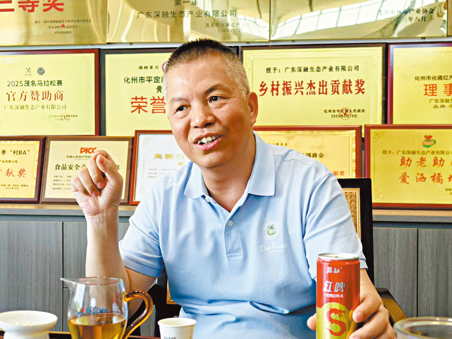 收果是投產面臨的第一道難題。「以前橘紅果每斤僅賣2-3元,農戶種植積極性不高,原料品質也參差不齊。」為破解這一困境,黃光振果斷將橘紅果收購價保底至6元/斤,近年逐步漲至10元/斤,成為當地首家推出保底收購政策的企業。「農戶們通宵排隊送果,攥着現金、盯着手機到賬提示,臉上的笑容藏都藏不住。」如今,深融公司已擁有1.6萬畝自有及合作果園,佔化州橘紅總種植面積的十分之一,直接帶動超一萬名鄉親在家門口就業增收。