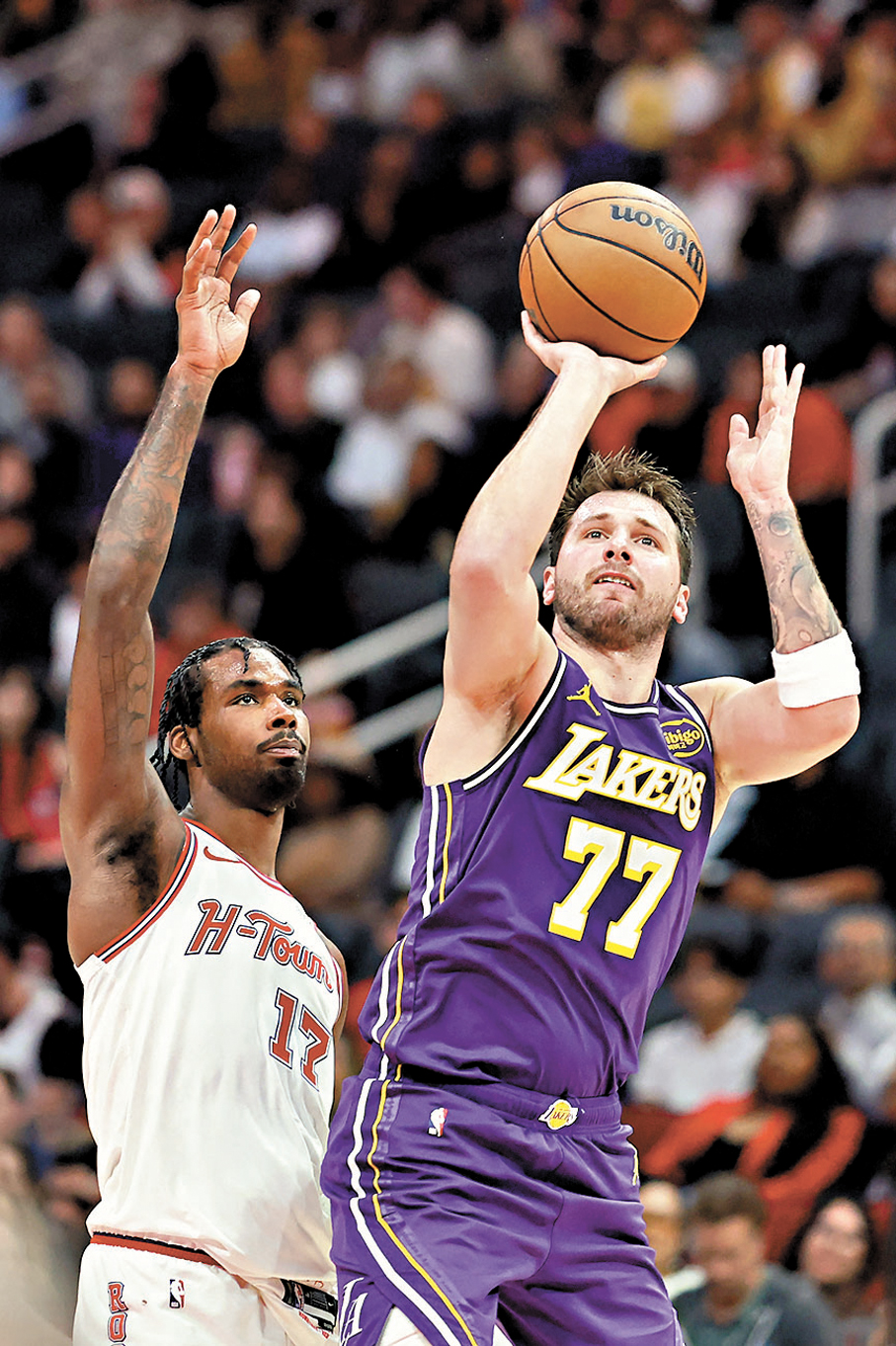 香港文匯報訊(記者 張發兒)洛杉磯湖人與侯斯頓火箭三天內第二度交手,此戰湖人雙星盧卡當錫、勒邦占士依舊表現出色,其中當錫全場狂轟七球三分球,取得40分、9籃板及10助攻;勒邦占士則14射13中,取得30分,助球隊作客以124:116勝出,收穫七連勝,穩住西區第三名席位。