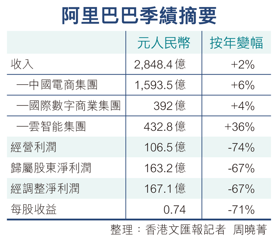 阿里昨公布截至去年12月底第三財季業績,收入按年微增2%至2,848.4億元(人民幣,下同),期內集團對即時零售、科技等投入有所加大,歸屬股東淨利潤下跌67%至163.2億元,經調整淨利潤縮水67%至167.1億元,略低於市場預期。