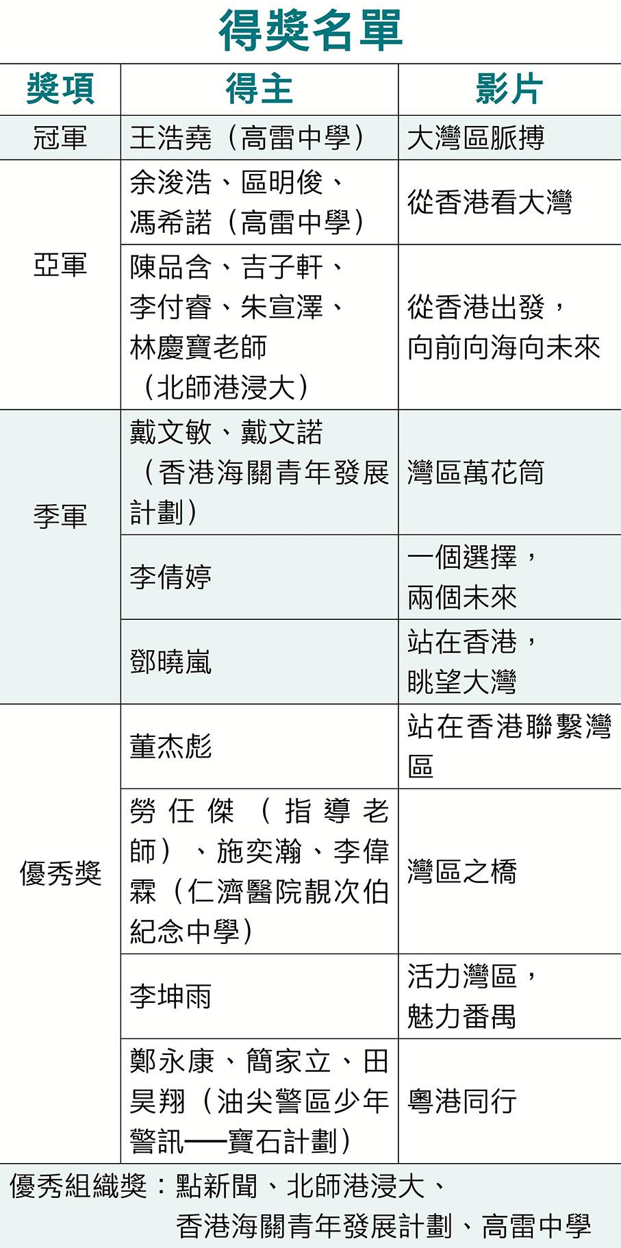 獲得亞軍、同樣來自高雷中學的余浚浩、馮希諾亦希望未來能深耕影視行業。他們對記者表示,此次影片創作靈感源於去年參加的內地交流團,他們走進深圳的科技公司,親身見證了數百架無人機編程燈光秀的震撼場景。就讀中六的二人,因學校課程緊湊未能撥出太多創作時間,拍攝與後期剪輯僅用了兩三天,還耗費大量精力搜尋、拼合此前交流團素材。