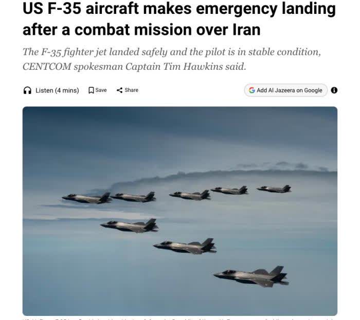 據報道,美國中央司令部發言人蒂姆·霍金斯表示,這架戰機在「執行伊朗上空的作戰任務」時被迫緊急降落,已安全着陸,飛行員狀況穩定,事件正在調查中。