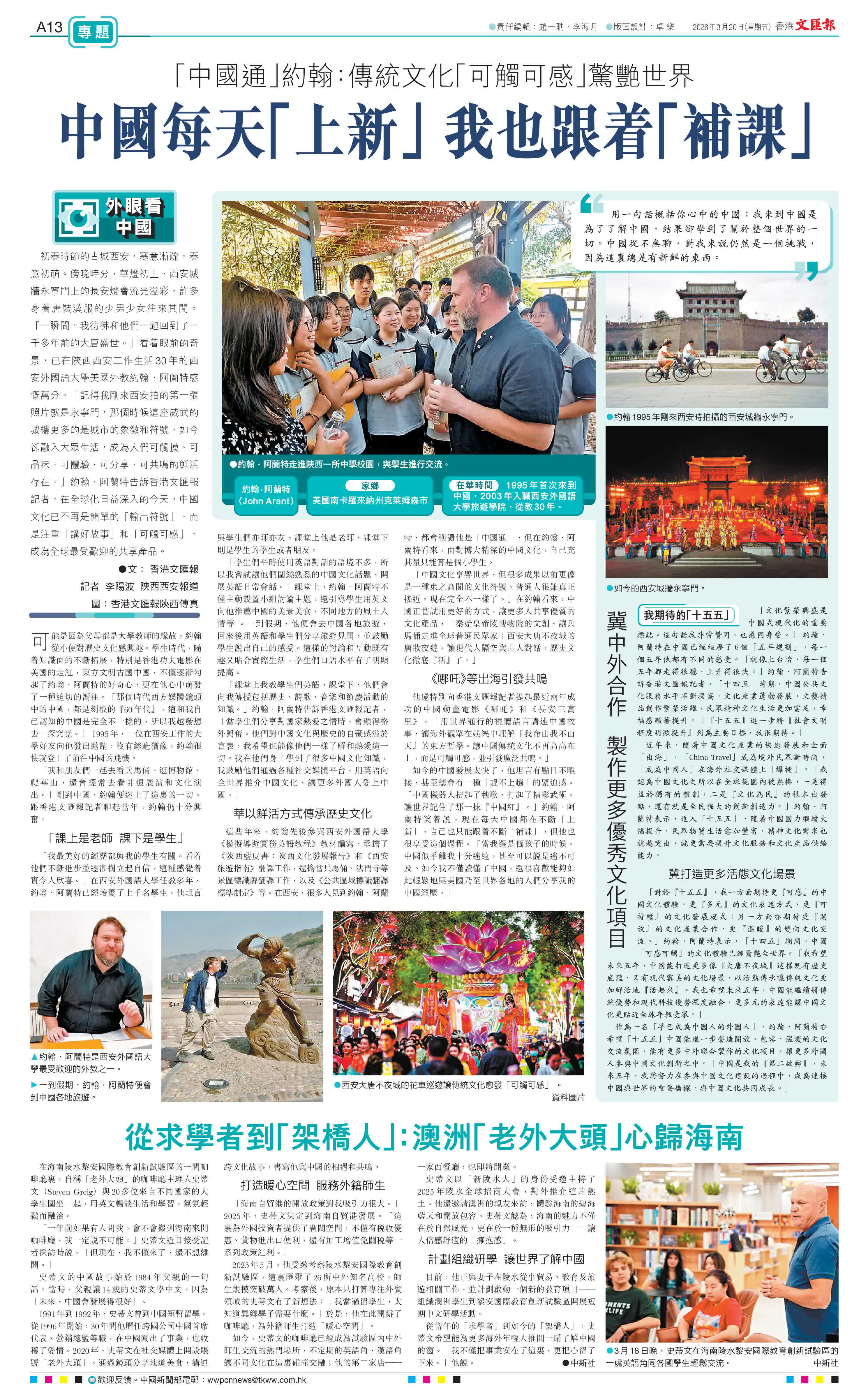 「我和朋友們一起去看兵馬俑、逛博物館、爬華山,還會經常去看非遺展演和文化演出。」剛到中國,約翰便迷上了這裏的一切。跟香港文匯報記者聊起當年,約翰仍十分興奮。