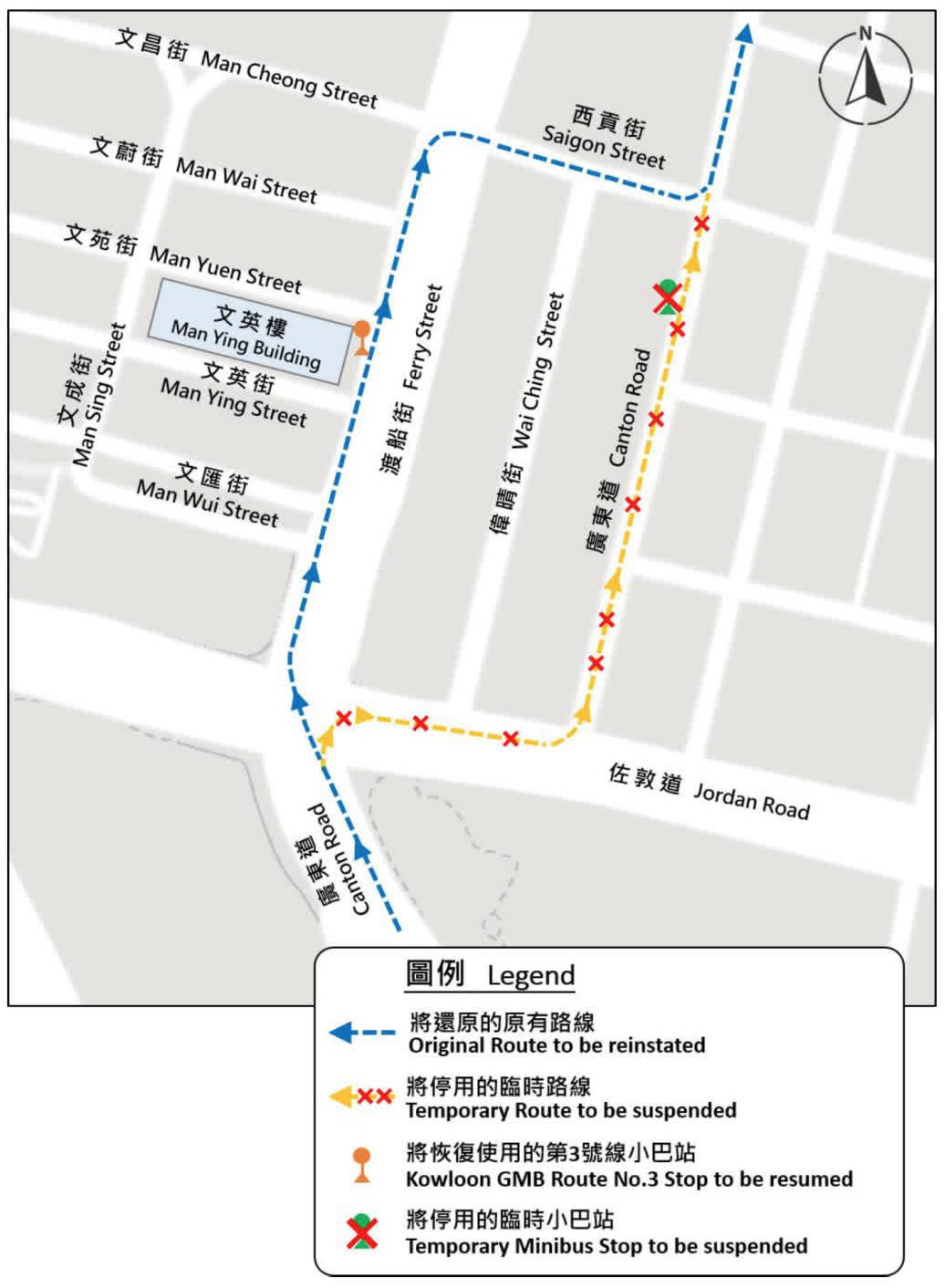 所有車輛將禁止由廣東道(北行)轉入西貢街,以及由西貢街(西行)前行至上述一段西貢街;沿西貢街(西行)或廣東道(北行)前往渡船街或偉晴街的車輛,須返回原有路線,即沿廣東道(北行)左轉至甘肅街(西行);及九龍專線小巴第3號線將恢復原有小巴站,營辦商會張貼告示通知乘客。