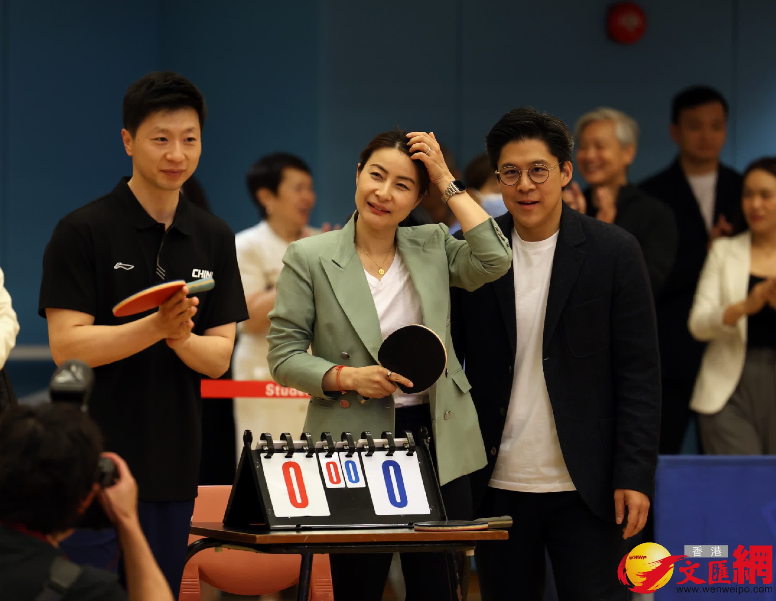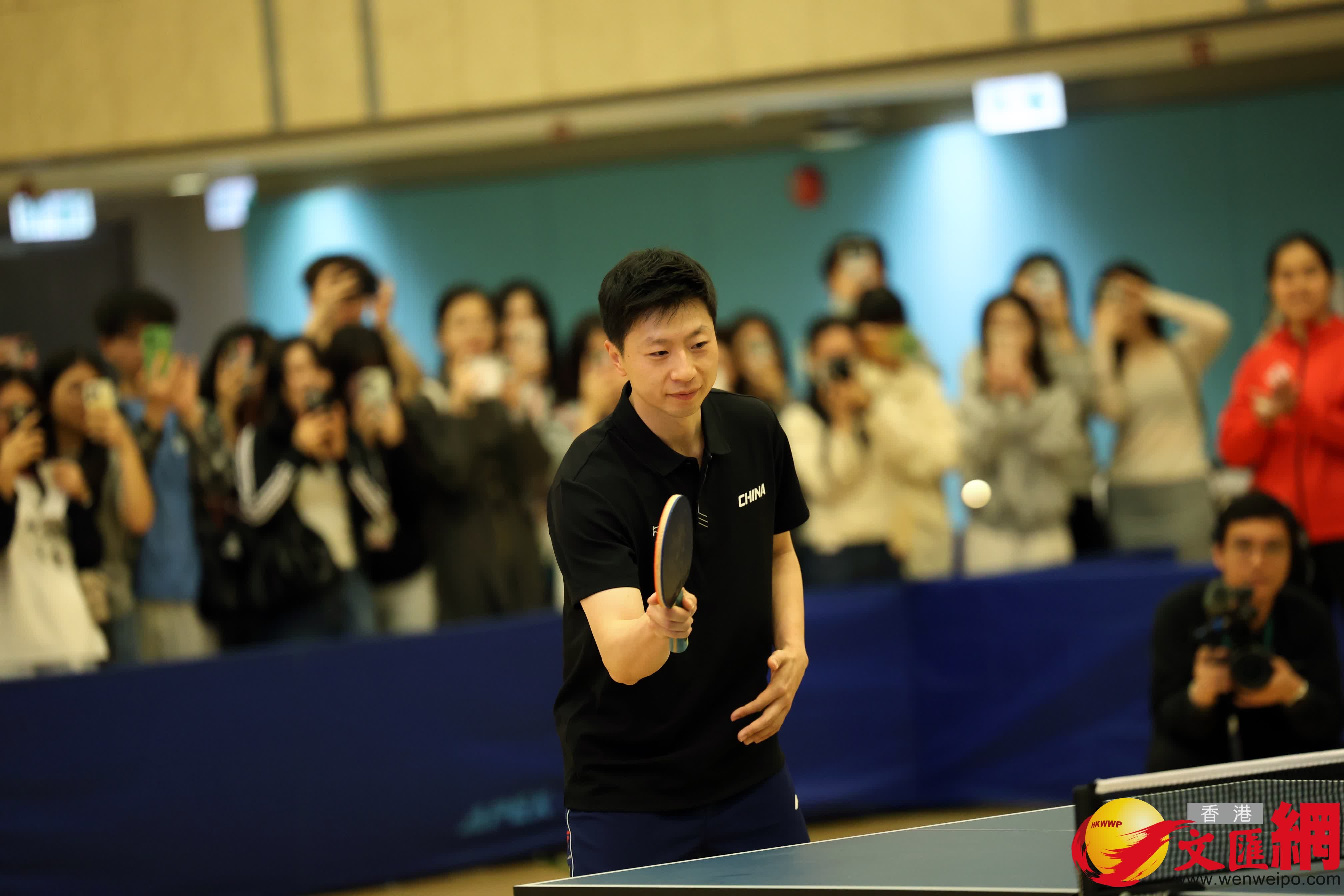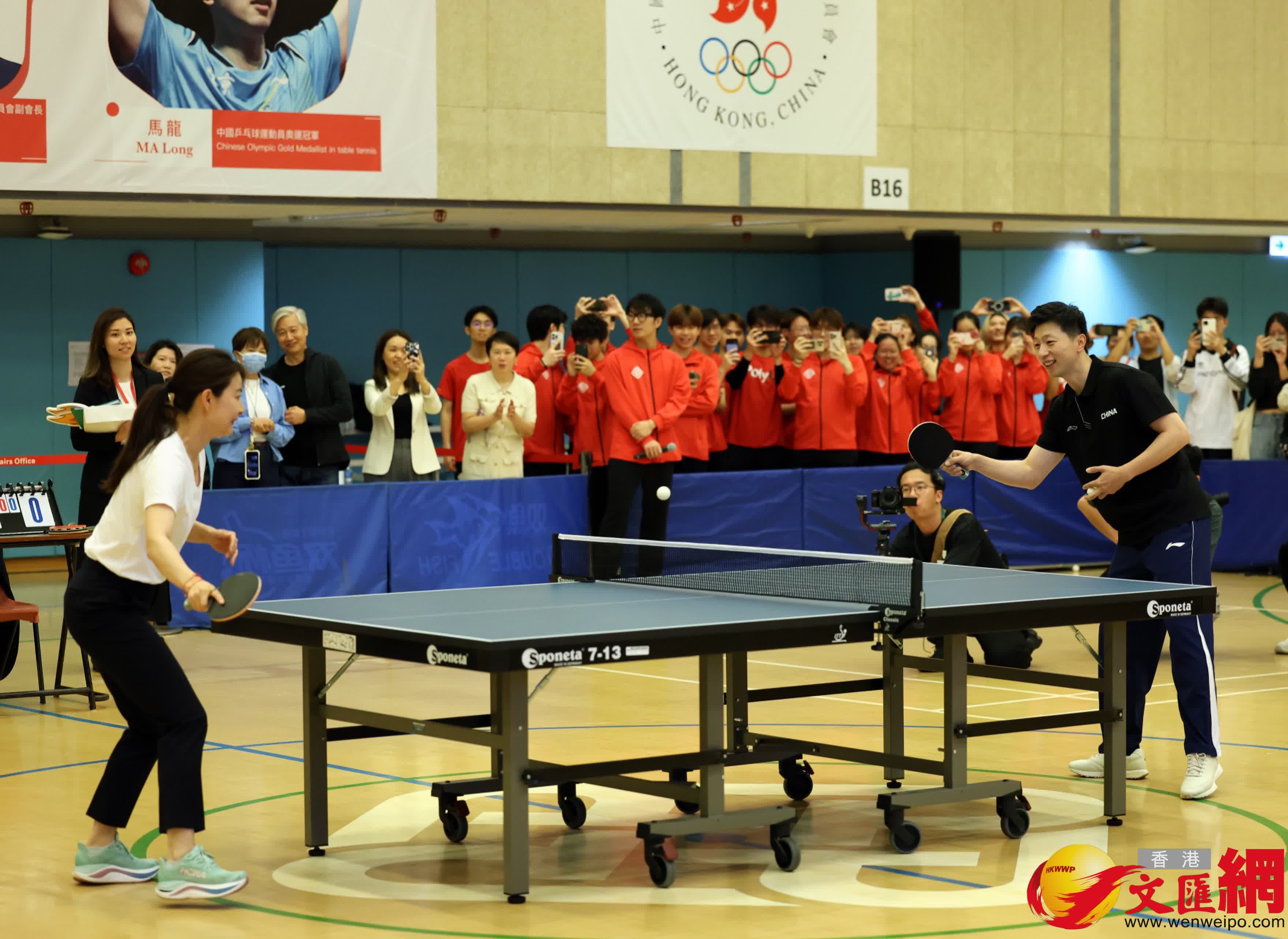 分享會結束後,馬龍與霍啟剛、以及理工大學乒乓校隊在體育館進行對打交流,郭晶晶也難得落場參與。近百名學生在場館觀戰,一睹奧運金牌英姿,氣氛熾熱。
