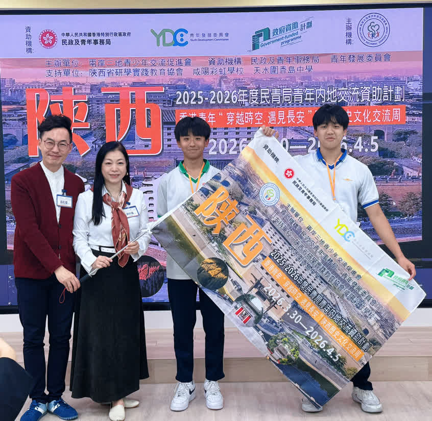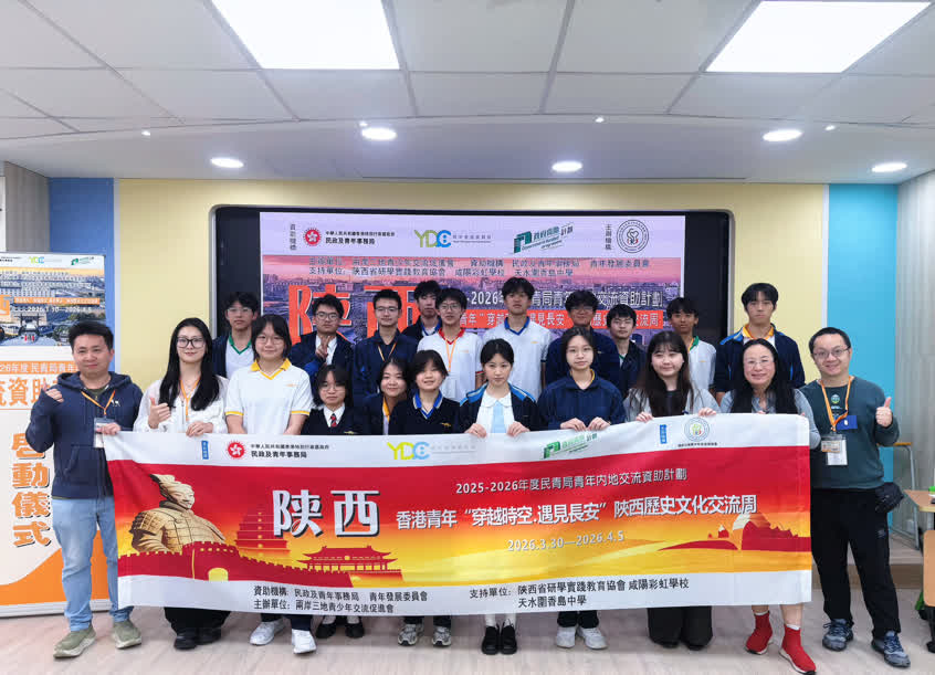 3月20日下午,由兩岸三地青少年交流促進會主辦,香港民政及青年事務局、青年發展委員會合辦及資助的2025-26 年度「香港民青局青年內地交流資助計劃」之「穿越時空·遇見長安」陝西歷史文化交流周啟動儀式,在香港天水圍香島中學舉行。香港青年發展委員會委員高松傑、香港立法會前議員郭玲麗、油尖旺區議員李家軒、香島中學特殊學習統籌主任李卓立及劉凱怡老師等嘉賓出席,與陝西交流團全體團員共同為此次文化探索之旅拉開序幕。