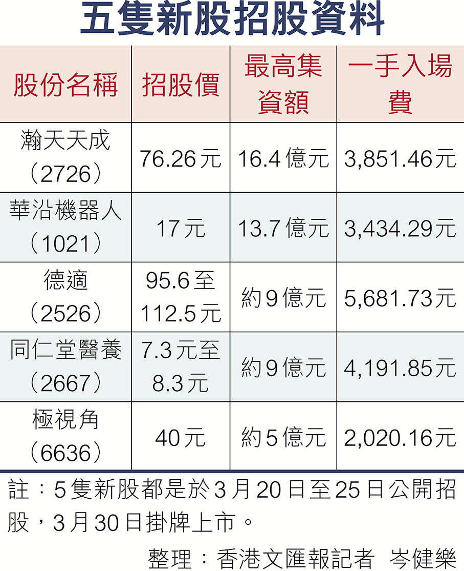 2026年香港新股市場持續興旺,今年來已有約20隻新股掛牌。昨日起,又有5隻新股至下周三公開招股,合共集資約53億元。該5隻新股分別為華沿機器人(1021)、德適(2526)、同仁堂醫養(2667)、瀚天天成(2726)與極視角(6636),其中以瀚天天成集資16.4億元最多。5隻新股將同時在3月30日掛牌。●香港文匯報記者 岑健樂