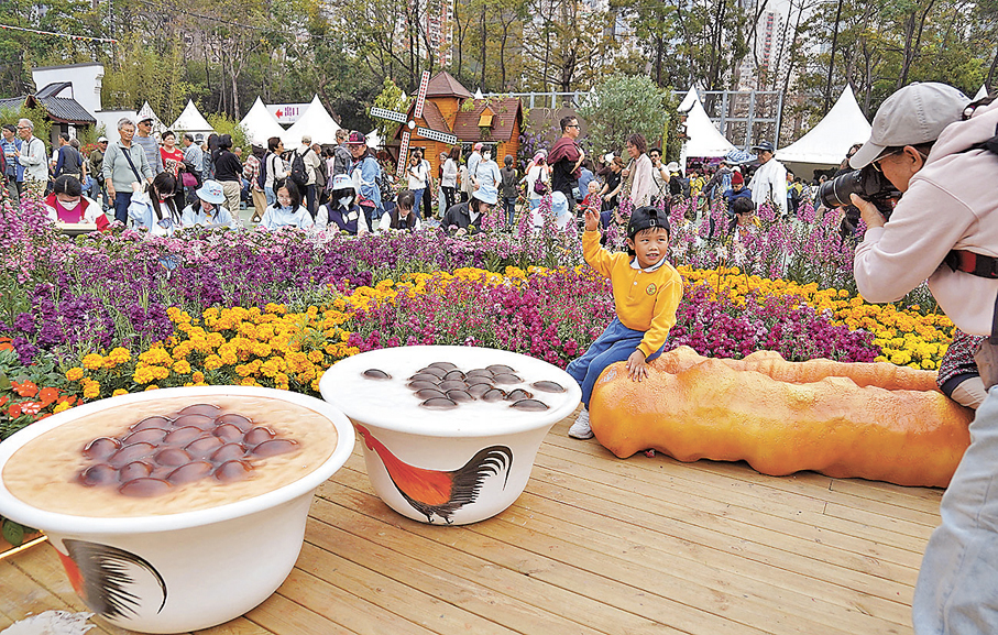 主題立體花牆前方,有超過1.4萬株不同顏色鬱金香組成的花海互相映襯