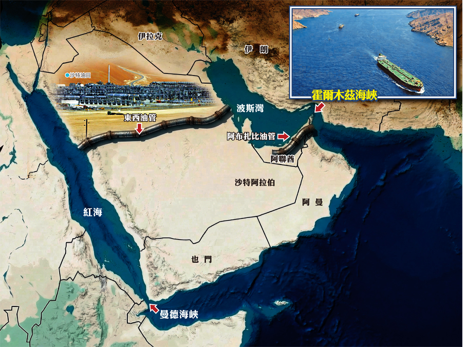沙特阿拉伯與阿聯酋曾嘗試建設繞開海峽的輸油管線,但現有設施的運力相當有限。阿聯酋的阿布扎比原油管道於2012年投產,全長420公里,連接哈卜善油田與阿曼灣的富查伊哈港,每日最大運輸量為每日150萬桶。沙特的東西輸油管道則早於上世紀八十年代兩伊戰爭期間興建,全長逾1,200公里,從東部產油區通往紅海岸的延布港,最大運力接近每日700萬桶,但其中約200萬桶需供應國內西部煉油廠,實際可供出口的僅餘約500萬桶。據國際能源署估計,戰事爆發後,仍有逾25%石油產品能依賴這兩條管道運出海灣地區。