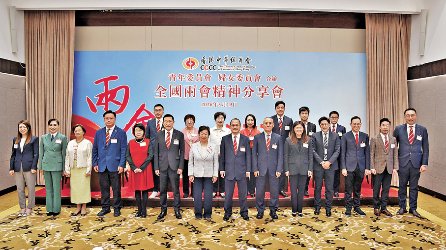 香港文匯報訊 (記者 黃子龍)香港中華總商會青年委員會及婦女委員會日前合辦全國兩會精神分享會,全國政協常委、中總會長蔡冠深擔任主題演講嘉賓,暢談今年兩會亮點及深刻體會,以及對工商青年及婦女的啟示。分享會亦邀請多名擔任港區全國人大代表、政協委員的中總成員進行交流,兩個委員會一眾成員及中總會員等約100人出席分享會。蔡冠深表示,國家安全是經濟發展的根基,我國本地生產總值持續增長充分體現制度優勢和發展韌性。他指出,香港應主動對接好國家「十五五」規劃,聚焦鞏固金融、航運、商貿及科技四大中心建設,尤其要加快國際創科中心發展和建設好高端人才集聚高地。