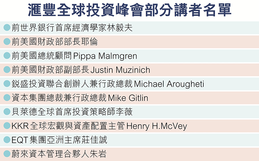 作為滙豐的旗艦盛事,第三屆滙豐全球投資峰會將於4月14日至16日在港舉行,峰會匯聚來自世界各地的嘉賓,探討推動全球經濟變革的關鍵因素。本屆峰會講者陣容鼎盛,除上述前美國財長耶倫等專家之外,還有多位重量級演講嘉賓,包括前世界銀行首席經濟學家林毅夫、滙豐集團行政總裁艾橋智、倫敦證券交易所集團行政總裁霍格特(Dame Julia Hoggett),及暢銷書作家Malcolm Gladwell。行政長官李家超及財政司司長陳茂波亦將出席及演說。