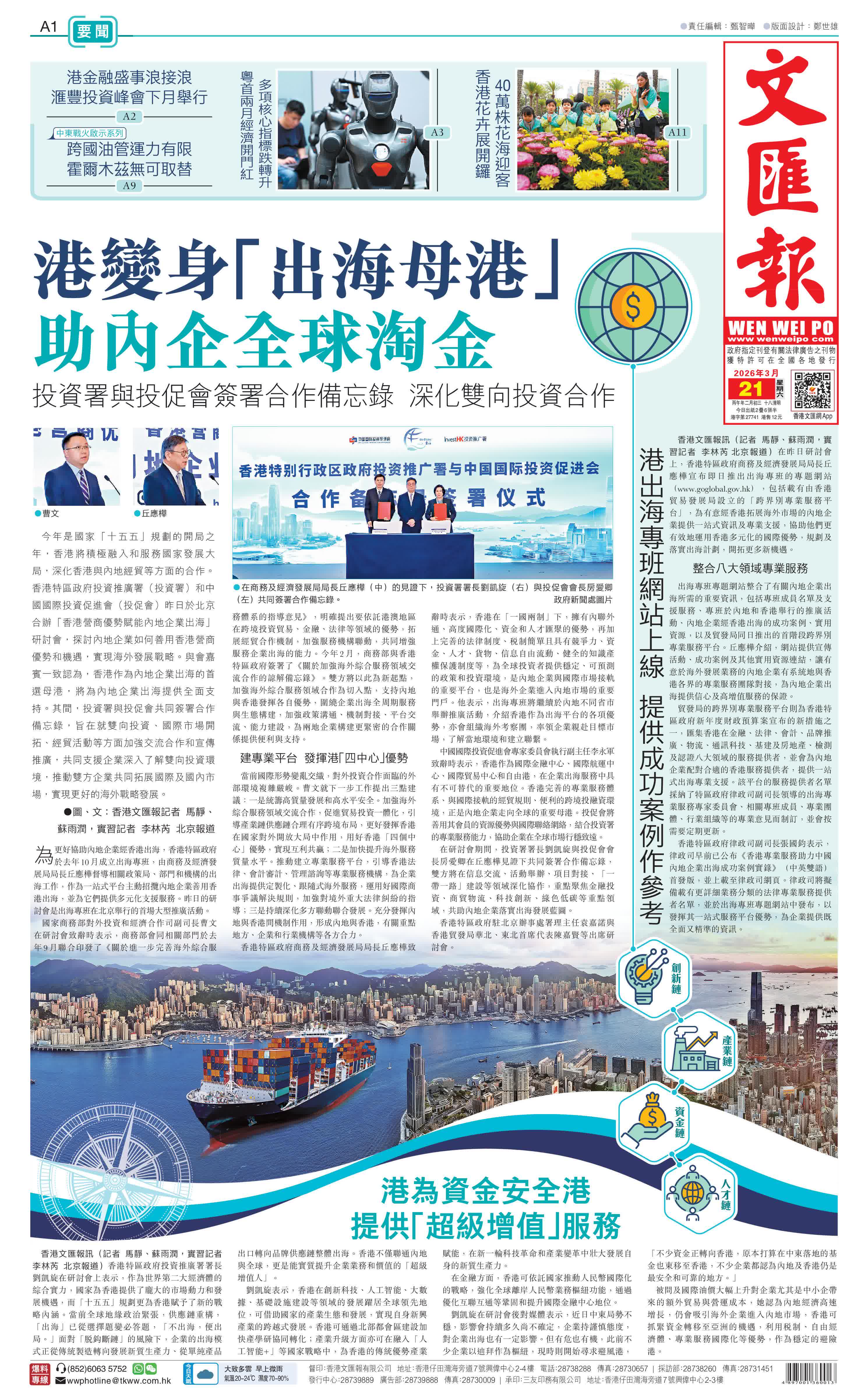 香港文匯報訊(記者 馬靜、蘇雨潤,實習記者 李林芮 北京報道)今年是國家「十五五」規劃的開局之年,香港將積極融入和服務國家發展大局,深化香港與內地經貿等方面的合作。香港特區政府投資推廣署(投資署)和中國國際投資促進會(投促會)昨日於北京合辦「香港營商優勢賦能內地企業出海」研討會,探討內地企業如何善用香港營商優勢和機遇,實現海外發展戰略。與會嘉賓一致認為,香港作為內地企業出海的首選母港,將為內地企業出海提供全面支持。其間,投資署與投促會共同簽署合作備忘錄,旨在就雙向投資、國際市場開拓、經貿活動等方面加強交流合作和宣傳推廣,共同支援企業深入了解雙向投資環境,推動雙方企業共同拓展國際及國內市場,實現更好的海外戰略發展。