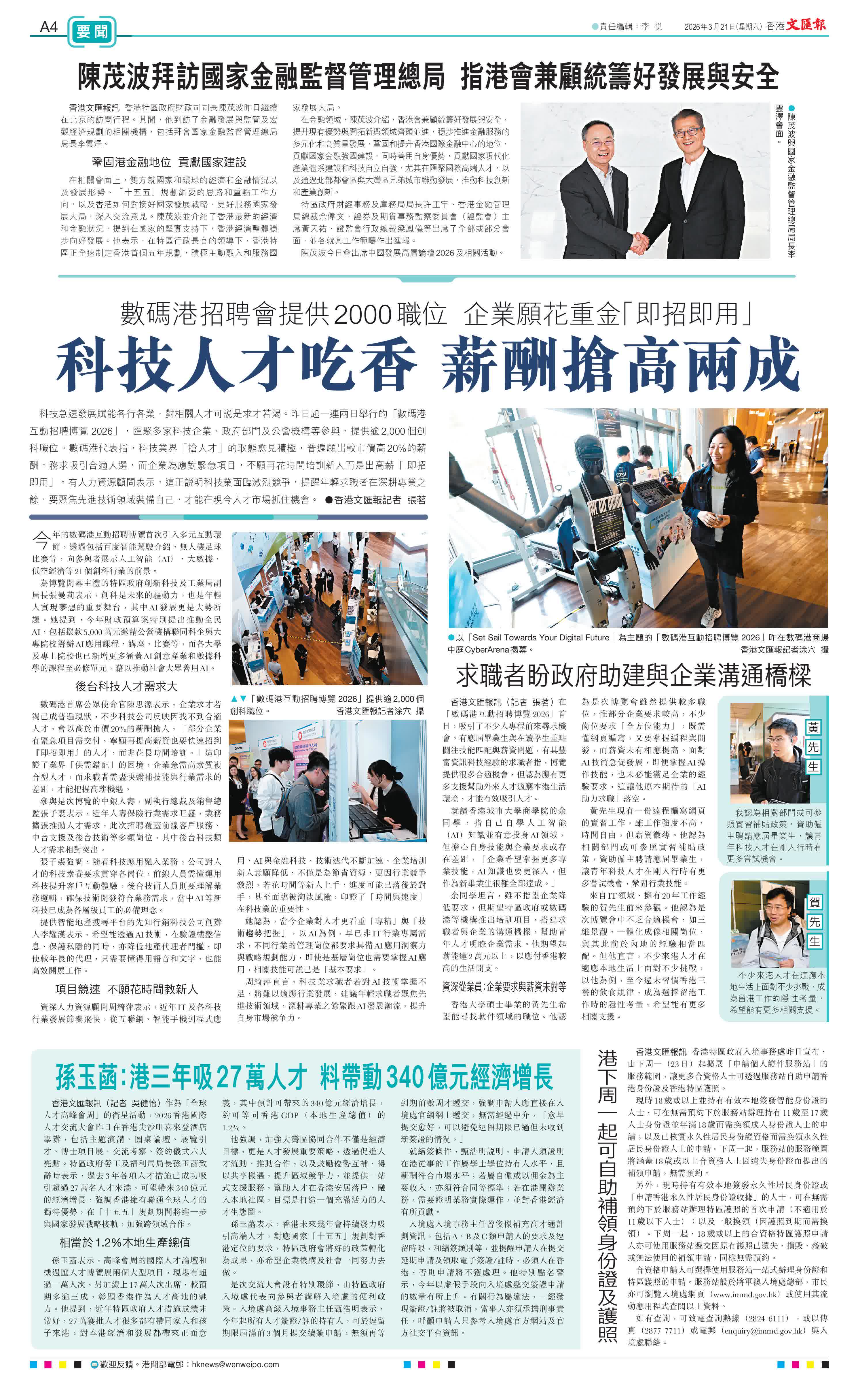 香港文匯報訊(記者 張茗)科技急速發展賦能各行各業,對相關人才可說是求才若渴。昨日起一連兩日舉行的「數碼港互動招聘博覽 2026」,匯聚多家科技企業、政府部門及公營機構等參與,提供逾2,000個創科職位。數碼港代表指,科技業界「搶人才」的取態愈見積極,普遍願出較市價高20%的薪酬,務求吸引合適人選,而企業為應對緊急項目,不願再花時間培訓新人而是出高薪「即招即用」。有人力資源顧問表示,這正說明科技業面臨激烈競爭,提醒年輕求職者在深耕專業之餘,要聚焦先進技術領域裝備自己,才能在現今人才市場抓住機會。
