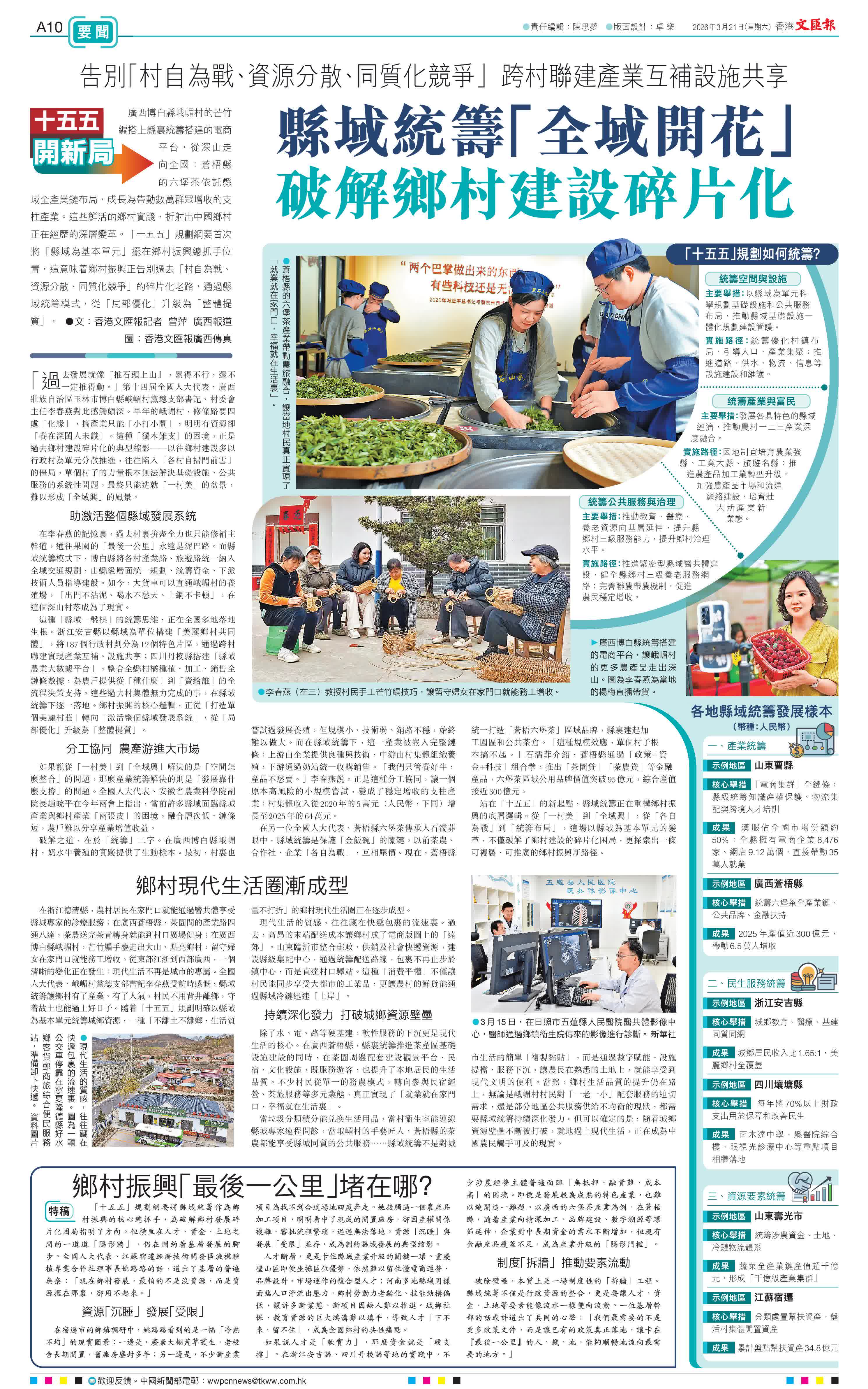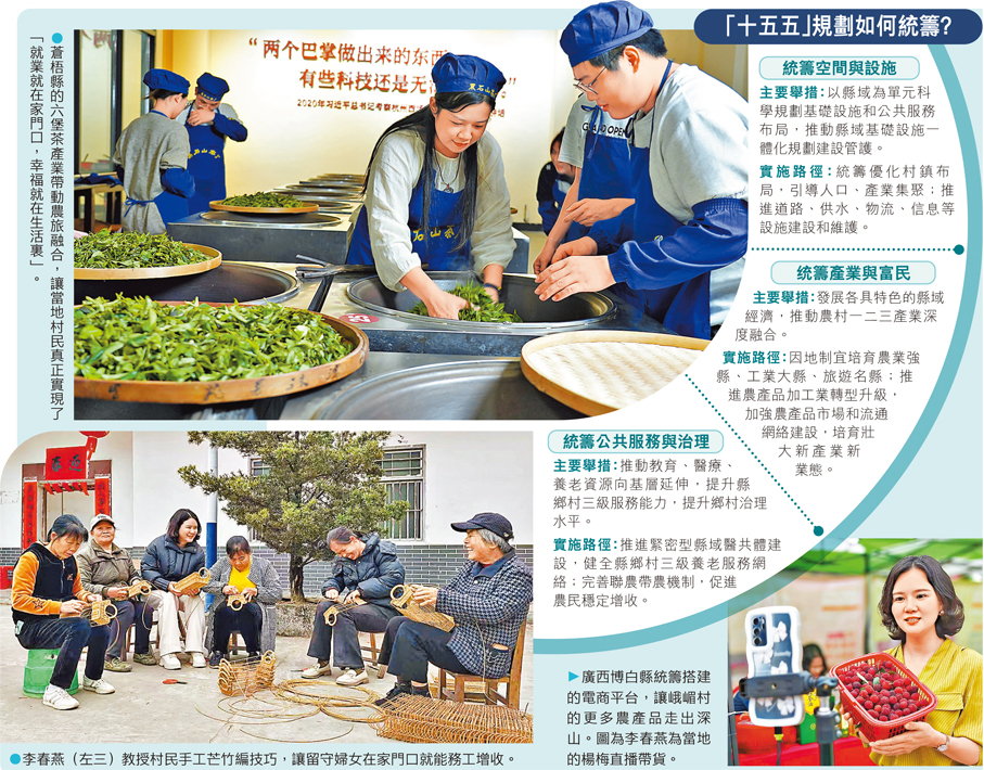 (香港文匯報記者曾萍 廣西報道 圖:香港文匯報廣西傳真)廣西博白縣峨嵋村的芒竹編搭上縣裏統籌搭建的電商平台,從深山走向全國;蒼梧縣的六堡茶依託縣域全產業鏈布局,成長為帶動數萬群眾增收的支柱產業。這些鮮活的鄉村實踐,折射出中國鄉村正在經歷的深層變革。「十五五」規劃綱要首次將「縣域為基本單元」擺在鄉村振興總抓手位置,這意味着鄉村振興正告別過去「村自為戰、資源分散、同質化競爭」的碎片化老路,通過縣域統籌模式,從「局部優化」升級為「整體提質」。