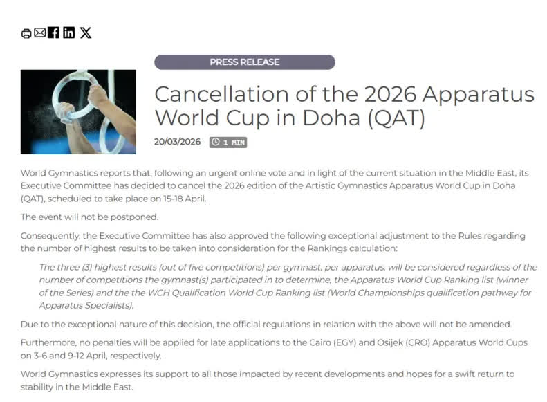 世界體操聯合會(以下簡稱「世界體聯」)官網20日消息,鑒於目前中東地區局勢,經緊急線上投票,世界體聯執委會決定取消原定於下月舉行的2026年體操單項世界盃多哈站比賽。