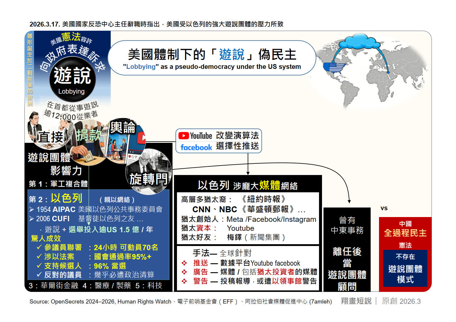 所謂美式民主,早已在遊說體制下徹底變質。猶太勢力在這次美以聯合軍事行動中,被美國國家反恐中心主任公開揭露出關鍵真相:與以色列人口規模相當的猶太社群長居美國,透過強大遊說體制深度影響、甚至綁架美國政府決策,讓美國政府服務於特定勢力利益,而非美國廣大民眾。