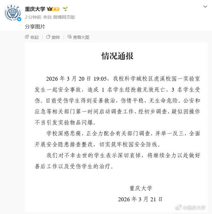 2026年3月20日19時5分,我校科學城校區虎溪校園一實驗室發生一起安全事故,造成1名學生經搶救無效死亡、3名學生受傷。目前受傷學生得到妥善救治,傷情平穩、無生命危險。公安和應急等相關部門第一時間啟動調查工作,經初步調查,疑似因操作不當引發實驗物品閃爆。
