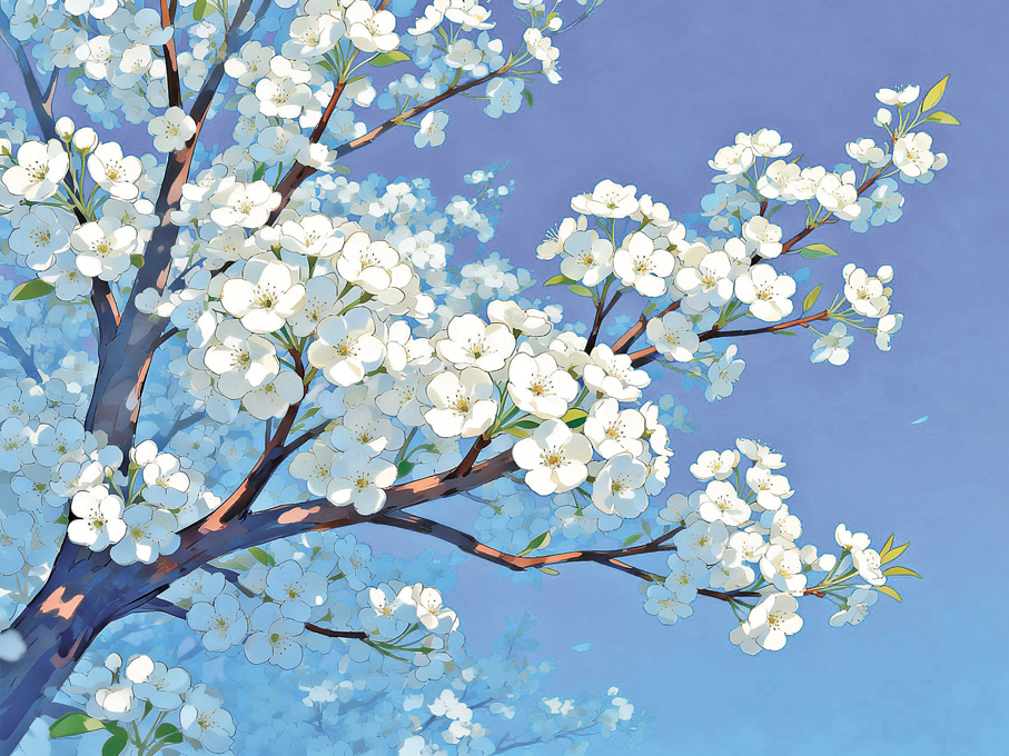 醉了?我微微一怔,抬頭細看。這才發覺,那滿樹的花,開得確有些不同。它們不像梅花那樣孤峭,也不似桃花那般冶艷。它們是一簇一簇,挨挨擠擠的,將柔嫩的、幾乎透明的瓣,毫無保留地攤開在春風裏。那白也不是純粹的死白,是玉一般的,潤潤的,在日頭下泛着瑩瑩的光,彷彿每朵花裏,都藏着一小盞溫潤的月光。風稍大些,花瓣便簌簌地落,不疾不徐,旋轉着,飄搖着,有幾片落在了劉伯的肩上、書頁上,他也渾然不覺。這光景,看久了,人心裏也彷彿被這軟白與暖風填滿了,生出一種懶洋洋的、微醺的陶然來。原來醉的,不只是花,更是看花的人,是這流轉的、慢下來的春光。
