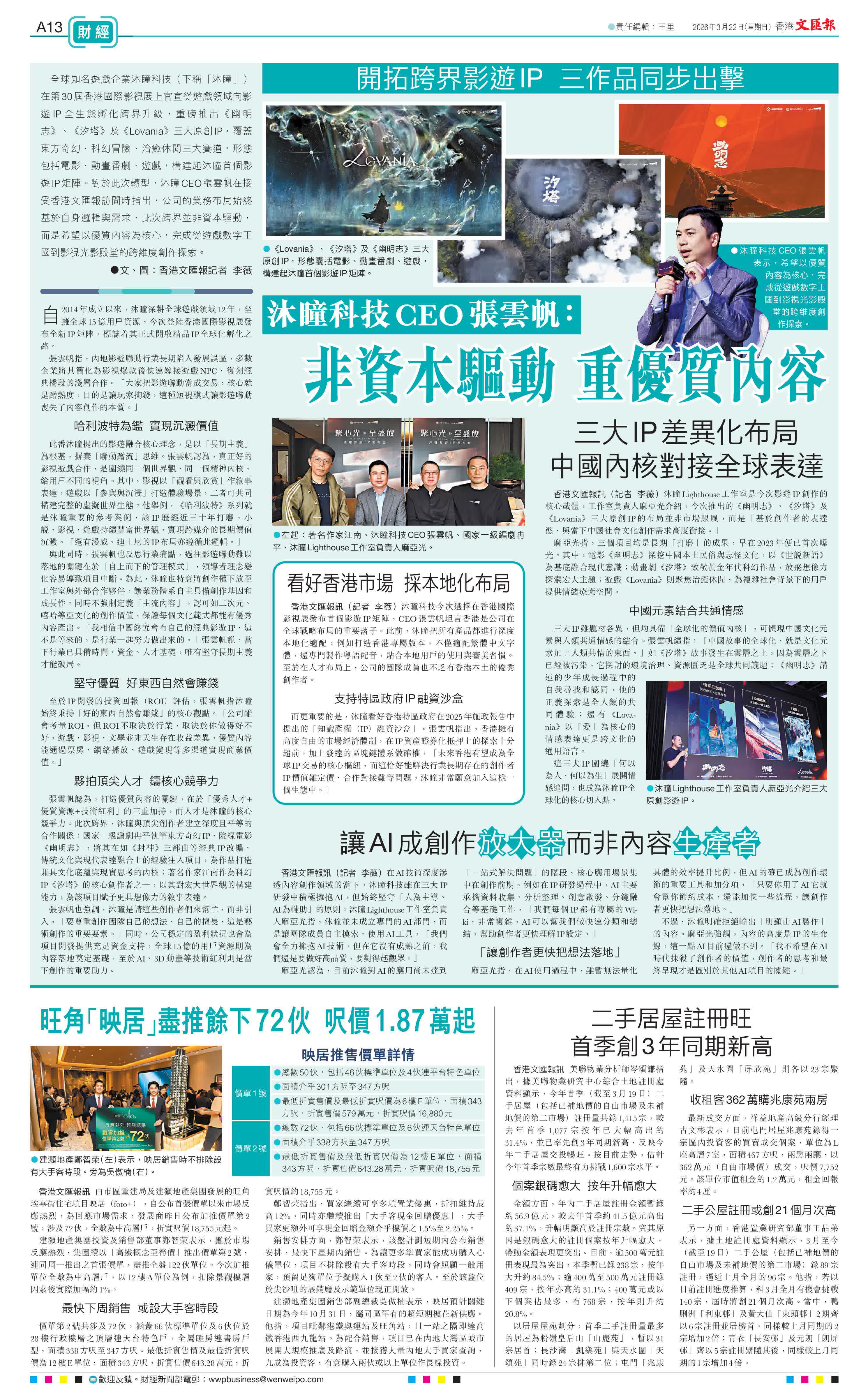 建灝地產集團銷售部副總裁吳傲楠表示,映居預計關鍵日期為今年10月31日,屬同區罕有的超短期樓花新供應。他指,項目毗鄰港鐵奧運站及旺角站,且一站之隔即達高鐵香港西九龍站。為配合銷售,項目已在內地大灣區城市展開大規模推廣及路演,並接獲大量內地大手買家查詢,九成為投資客,有意購入兩伙或以上單位作長線投資。