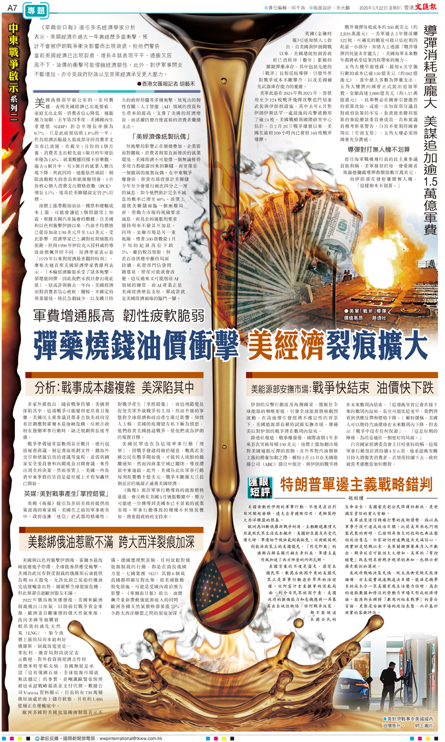 (香港文匯報記者 胡藝禾)《華爾街日報》援引多名經濟學家分析表示,美國經濟在過去一年裏經歷多重衝擊,預計不會被伊朗戰爭衝突影響而出現衰退。但他們警告當前美國經濟已出現裂痕,增長本就表現平平,通脹又居高不下,油價的衝擊可能侵蝕經濟韌性。此外,對伊軍事開支不斷增加,亦令美政府財政以至美國經濟承受更大壓力。
