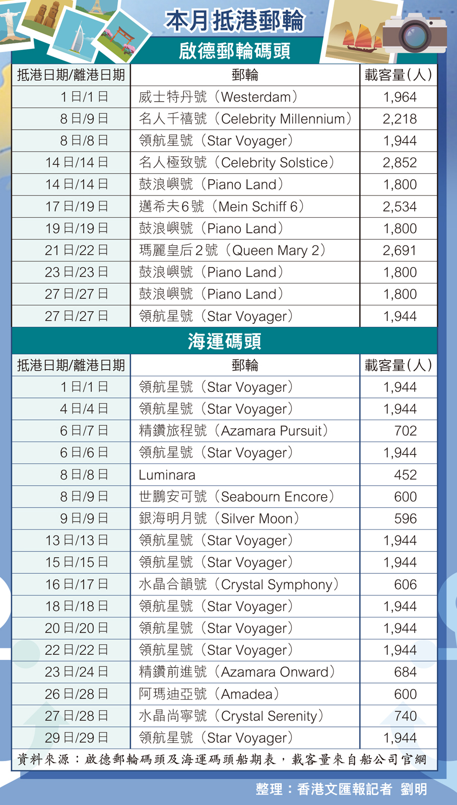根據啟德郵輪碼頭及尖沙咀海運碼頭的船期表,本月有多艘郵輪共28個航次停靠香港(見表),按各郵輪載客量約帶來約4.6萬名入境郵輪旅客,其中昨晨7時抵港停靠啟德郵輪碼頭的瑪麗皇后二號,乘客連同工作人員便有約3,000人,停靠兩日於今晚8時離開。