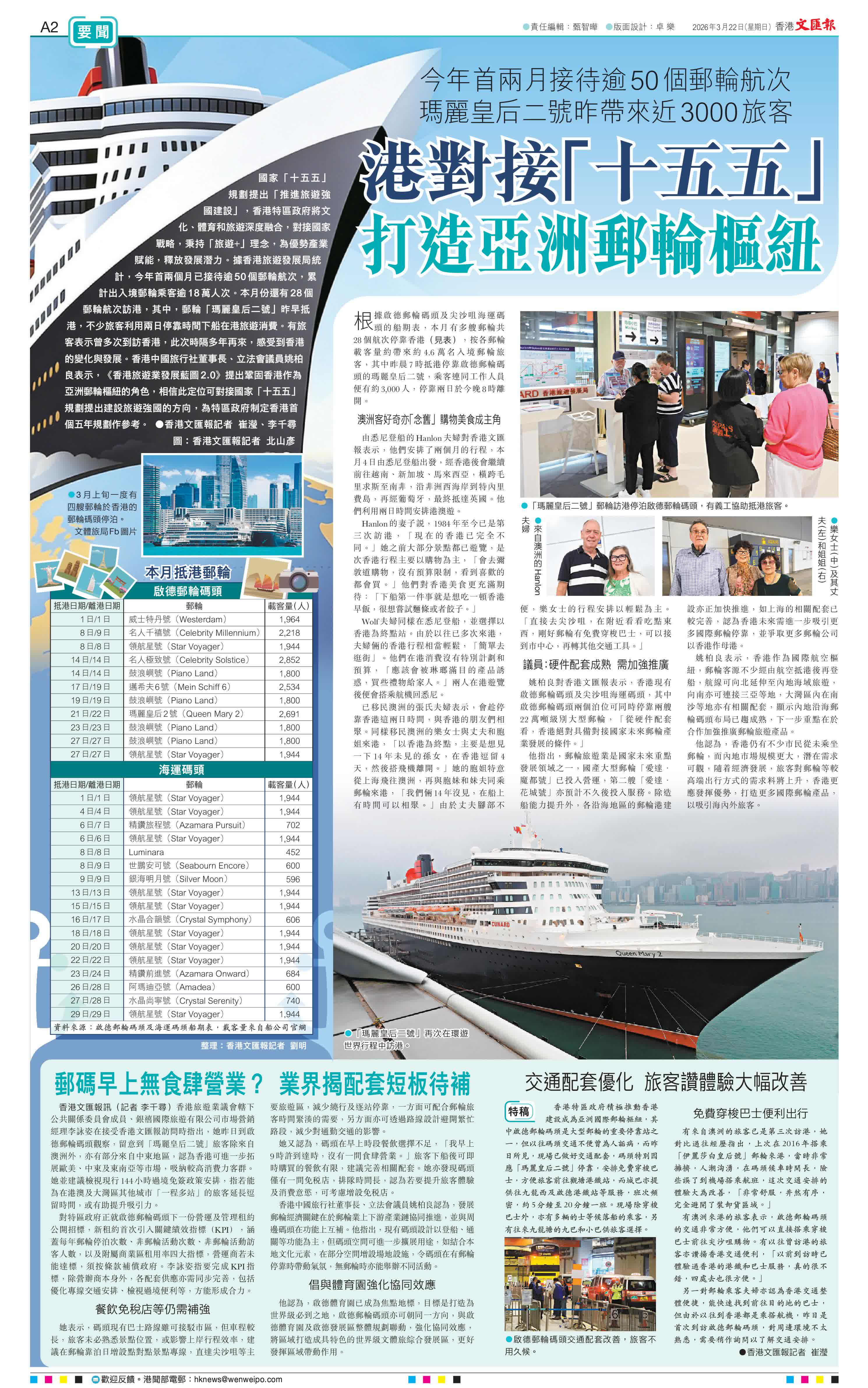 (香港文匯報記者 崔瀅、李千尋)國家「十五五」規劃提出「推進旅遊強國建設」,香港特區政府將文化、體育和旅遊深度融合,對接國家戰略,秉持「旅遊+」理念,為優勢產業賦能,釋放發展潛力。據香港旅遊發展局統計,今年首兩個月已接待逾50個郵輪航次,累計出入境郵輪乘客逾18萬人次。本月份還有28個郵輪航次訪港,其中,郵輪「瑪麗皇后二號」昨早抵港,不少旅客利用兩日停靠時間下船在港旅遊消費。有旅客表示曾多次到訪香港,此次時隔多年再來,感受到香港的變化與發展。香港中國旅行社董事長、立法會議員姚柏良表示,《香港旅遊業發展藍圖2.0》提出鞏固香港作為亞洲郵輪樞紐的角色,相信此定位可對接國家「十五五」規劃提出建設旅遊強國的方向,為特區政府制定香港首個五年規劃作參考。