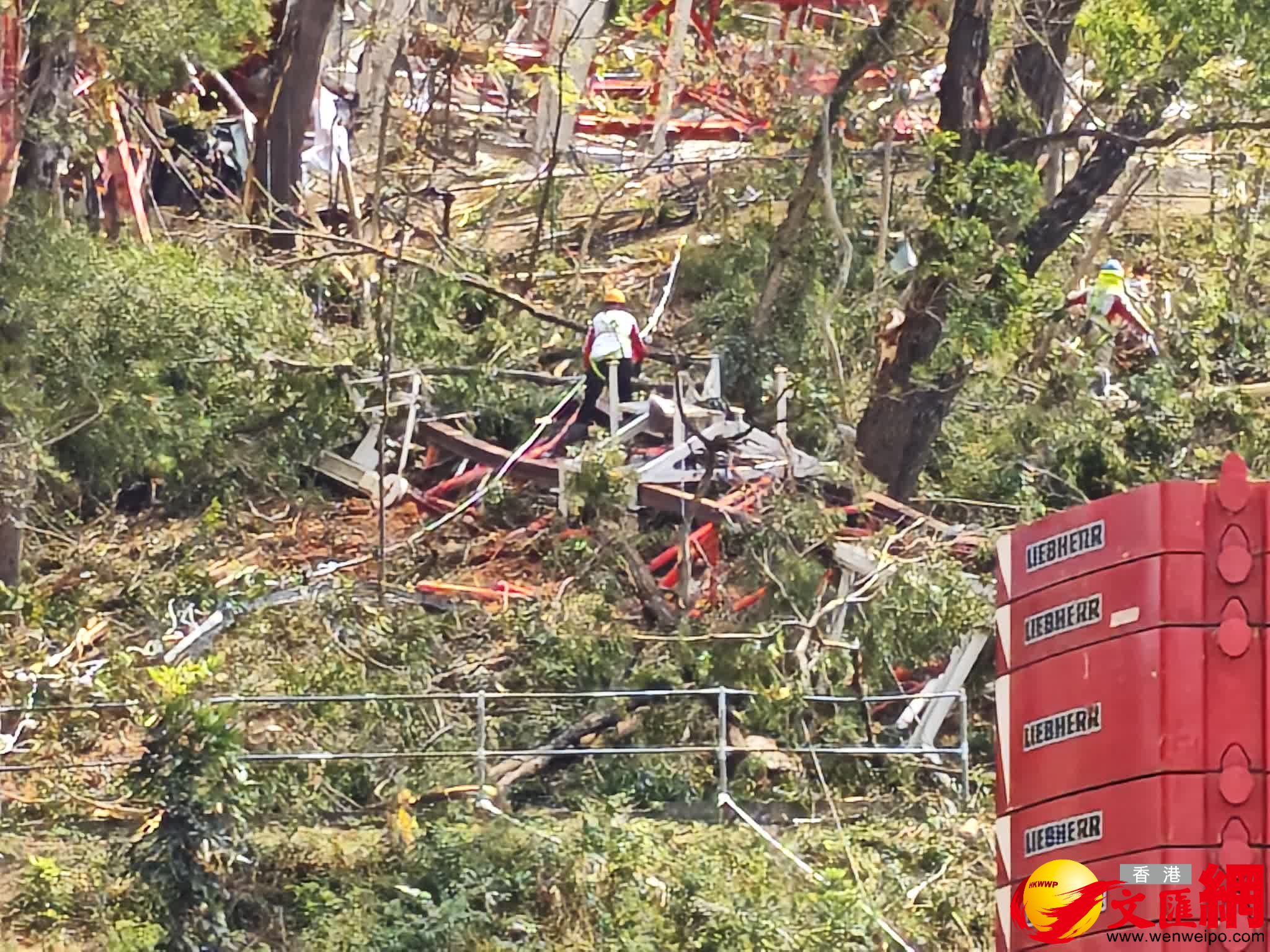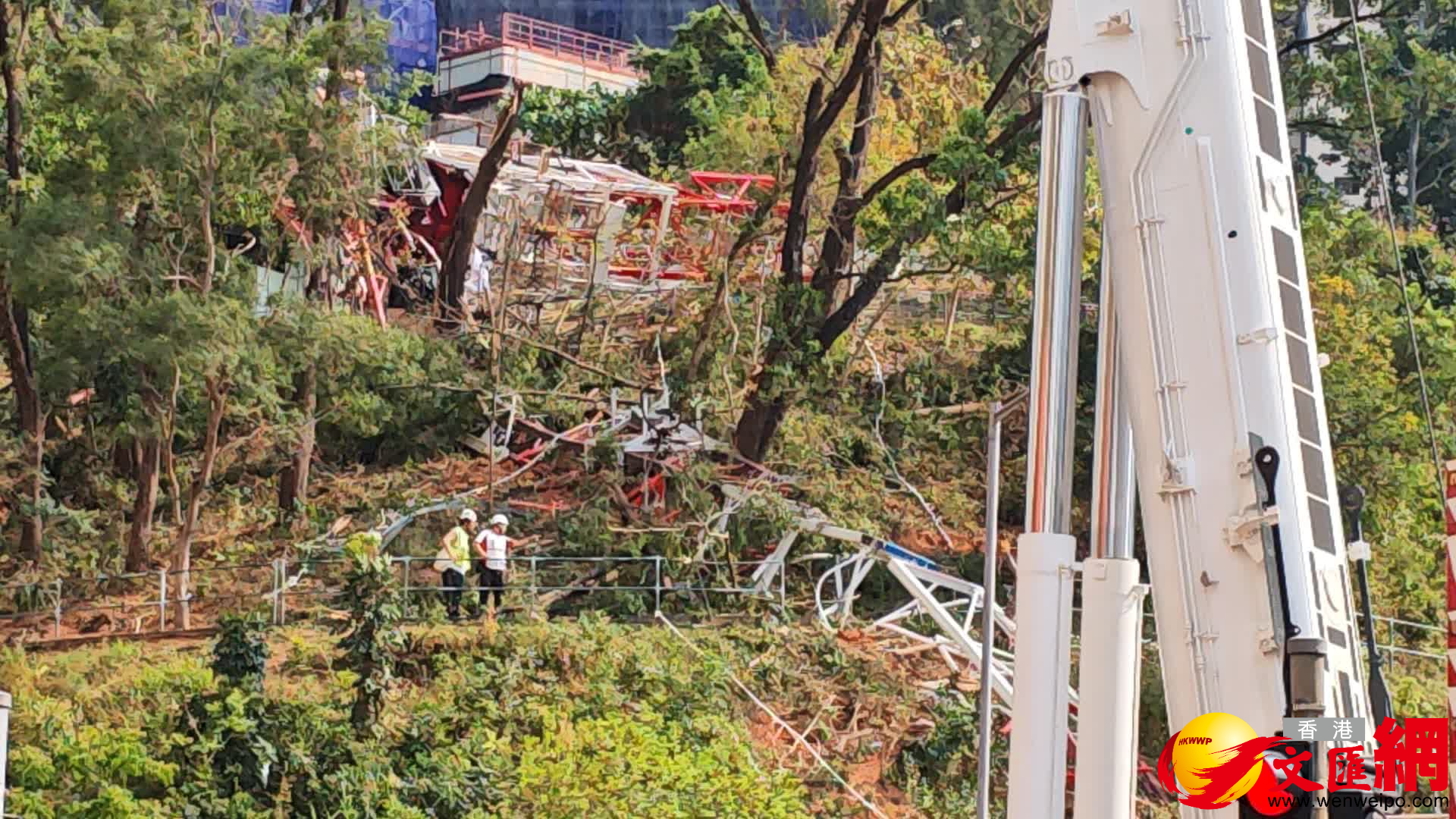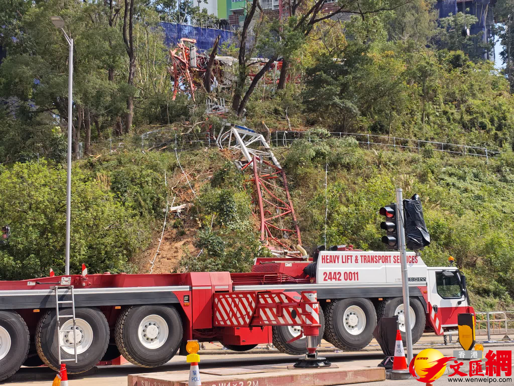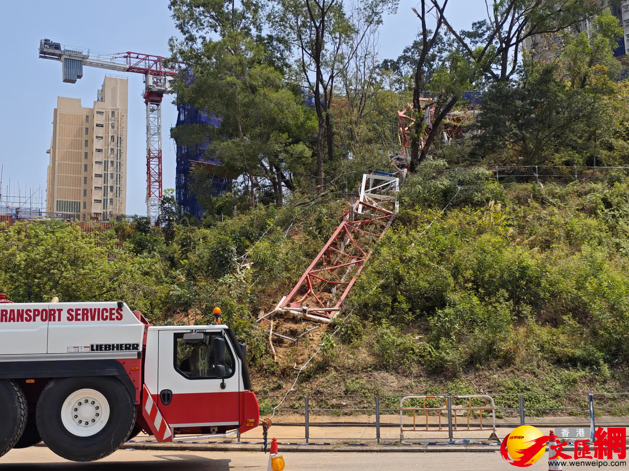 香港文匯報訊(記者 蕭景源)葵涌大窩口道公屋發展計劃第二期地盤一個天秤,在上周四(19日)下午突然倒塌,導致一名62歲操作員連人帶吊臂跌落山坡身亡。至今日(22日)下午約1時,有多輛吊臂車及貨櫃車駛至涉事地盤對開,預料有工程人員視察評估,準備在短期內把肇事天秤拆件,並用吊臂分批把殘骸吊運至貨櫃車運走。記者現場所見,上址山坡仍遺下部分斷裂的天秤殘骸,相信亦會在短期內被陸續運走。