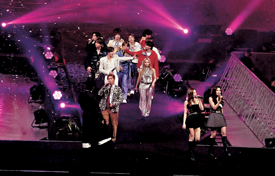 香港文匯報訊(記者 子棠)MIRROR成員姜濤、盧瀚霆(Anson Lo)、李駿傑(Jeremy),COLLAR成員王家晴(Candy)和蘇雅琳(Ivy),李幸倪(Gin Lee)、陳柏宇、許廷鏗、ZPOT、王偉俊及范卓賢前晚參演在啟德體藝館舉行的「仁愛堂呈獻:Cantopop321慈善演唱會」。Anson Lo與Gin Lee跳唱嗨爆,姜濤搞笑自封「求其王」,自言羨慕Anson Lo與外國女星對戲 ,因英文欠佳,很想趁機學好英文。