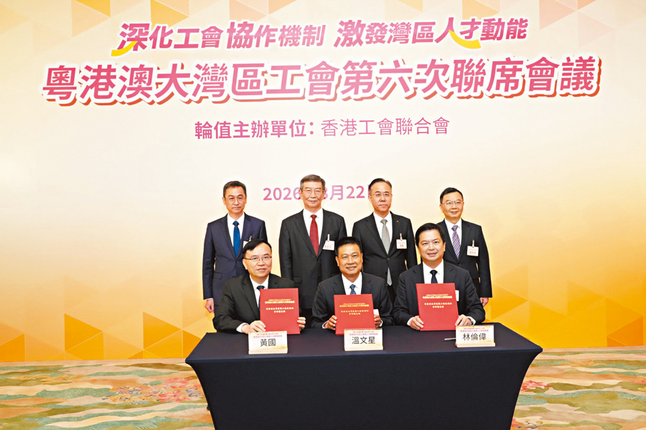 香港文匯報訊 由香港工聯會輪值主辦的「粵港澳大灣區工會第六次聯席會議」昨日舉行,會議主題為「深化工會協作機制 激發灣區人才動能」,目的是深化工會協作機制,推動人才培養與技能提升,支持和推動港澳特區更好地融入和服務國家發展大局,使廣大職工人才為粵港澳大灣區高質量發展貢獻自身力量。工聯會會長吳秋北於致辭時表示,國家「十五五」規劃為灣區發展繪就了嶄新藍圖,也為工會工作提出更高要求。